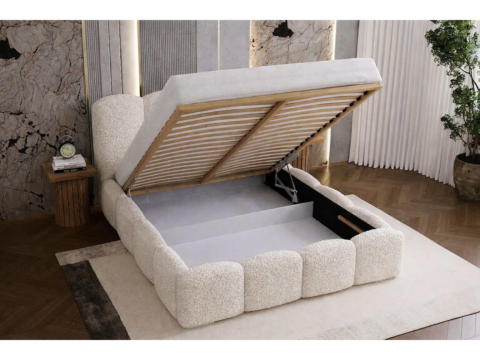Lit adulte bouclé 200x200 Zenna - coffre de rangement, sommier - Crème (Lambi 1)