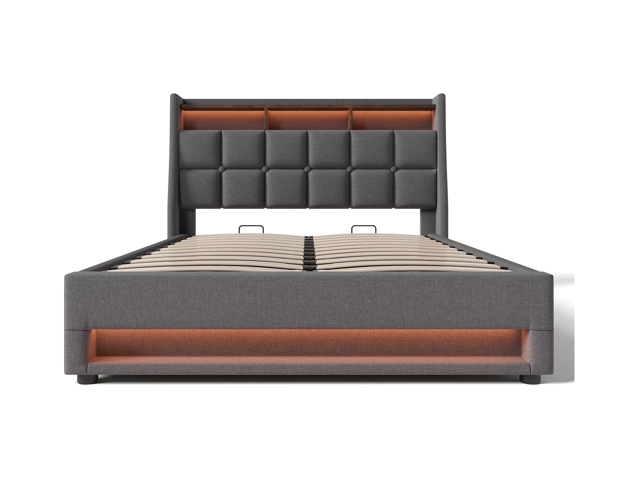Lit coffre 180x200 cm avec avec sommier - tête de lit capitonnée avec USB et LED - tissu lin - gris (sans matelas)
