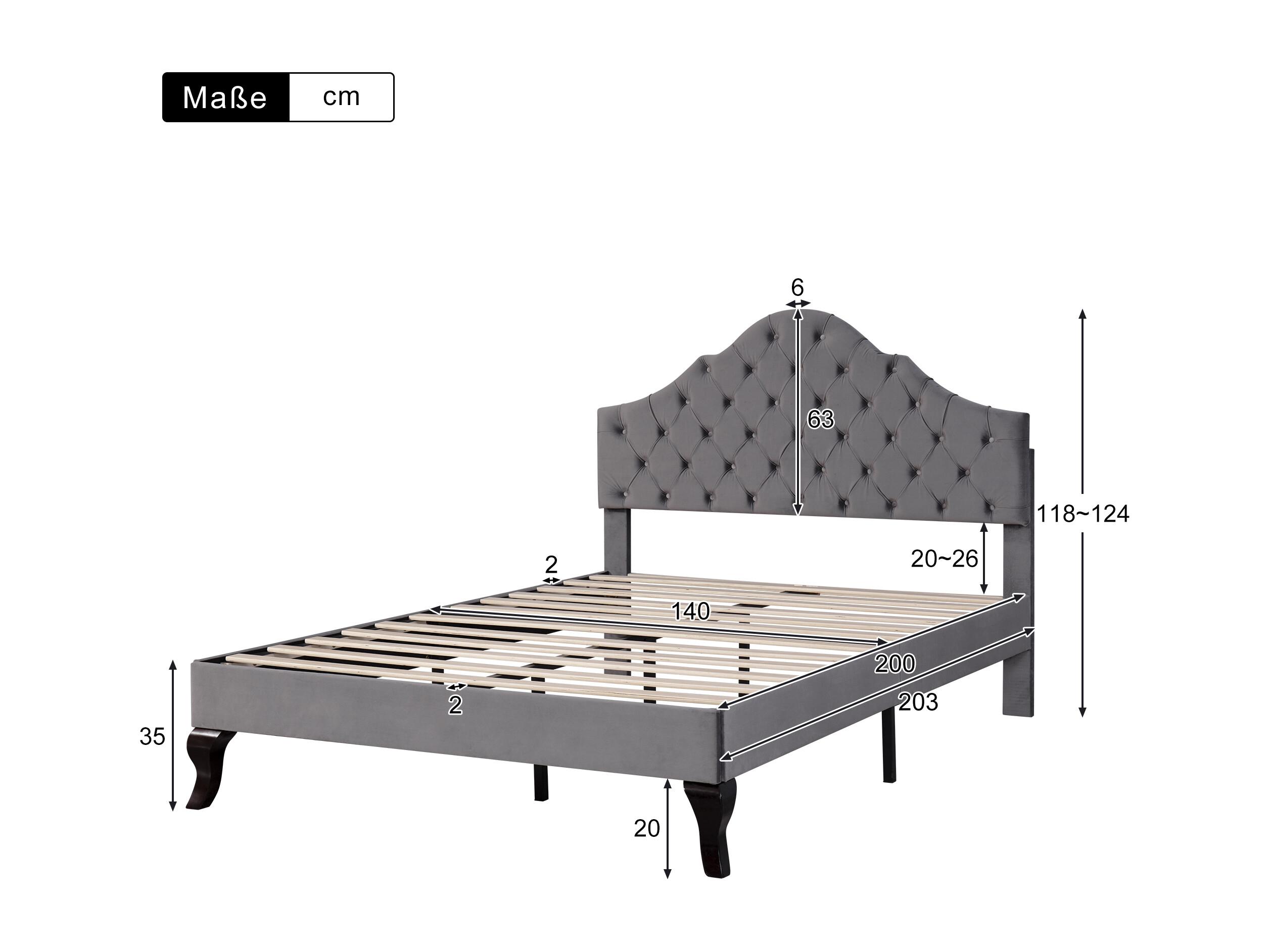 Lit adulte double 140x200 avec sommier - tête de lit réglable en hauteur - cadre de lit en bois - velours gris (sans matelas)