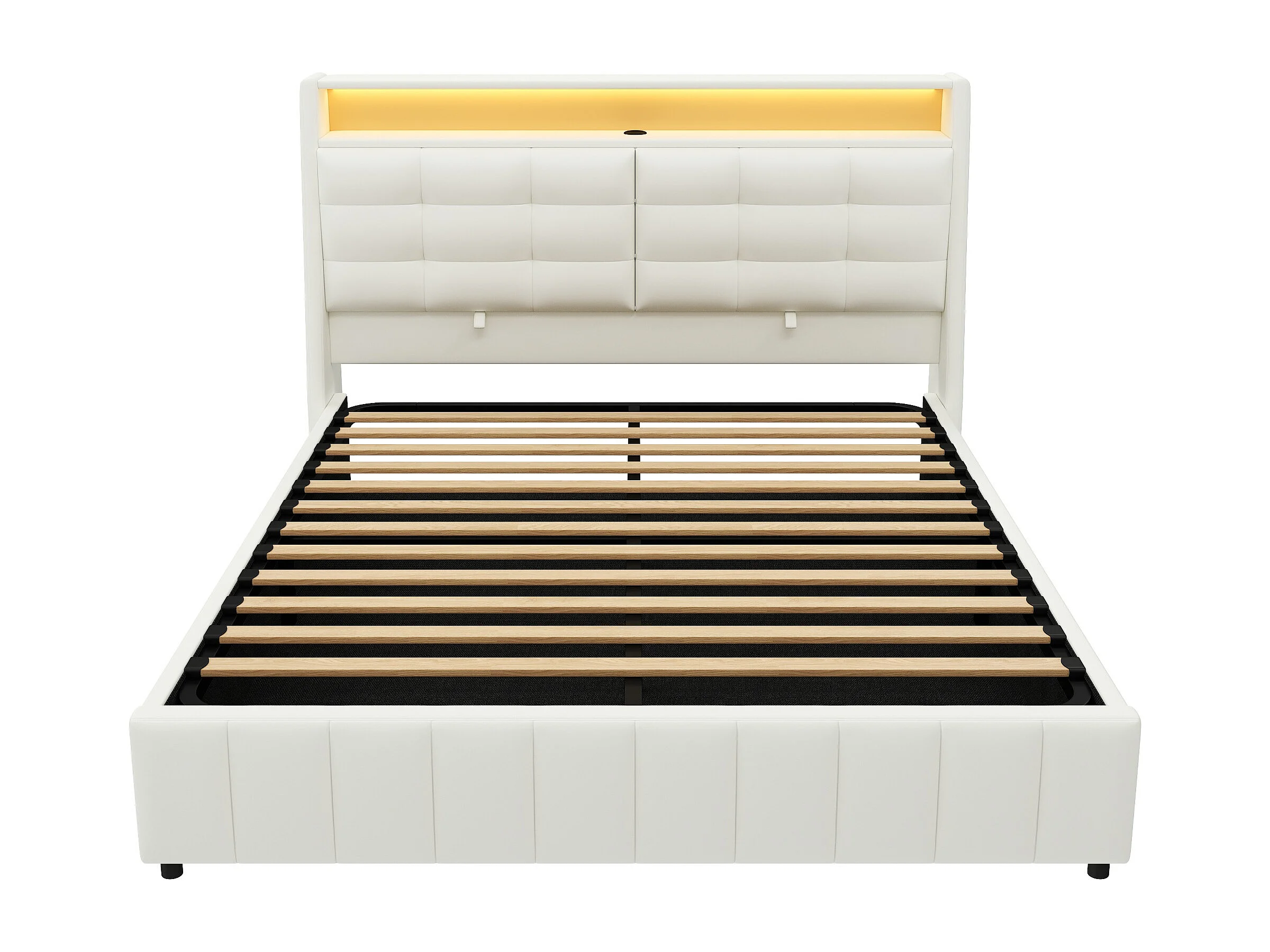 Lit plateforme 160x200 avec rangement sous le lit, éclairage LED 7 couleurs et USB, dossier réglable, MDF contreplaqué PU, blanc (Sans matelas)