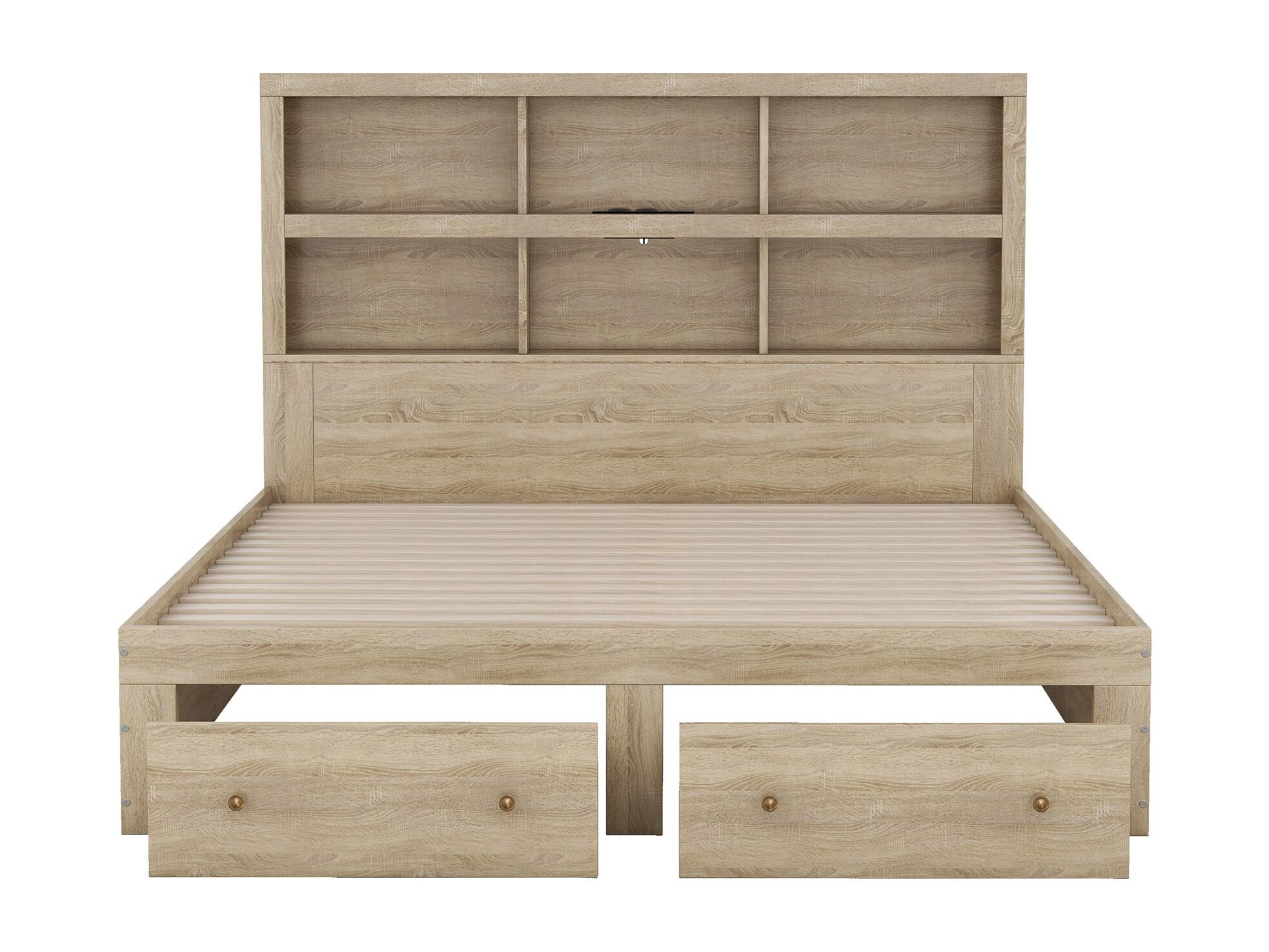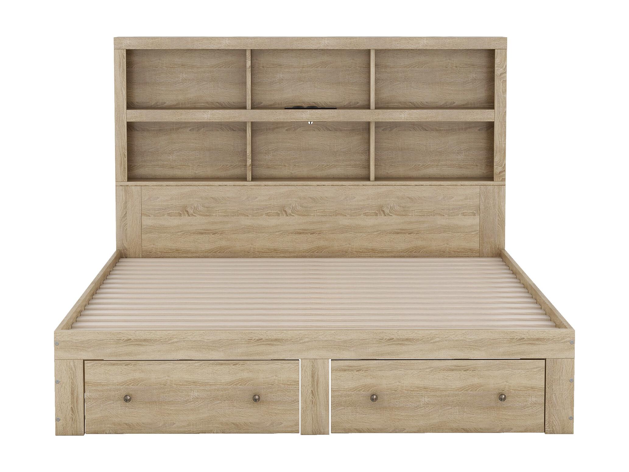 Lit adulte double 160x200 cm avec 2 tiroirs - tête de lit avec rangement et USB - bois - naturel clair (sans matelas)