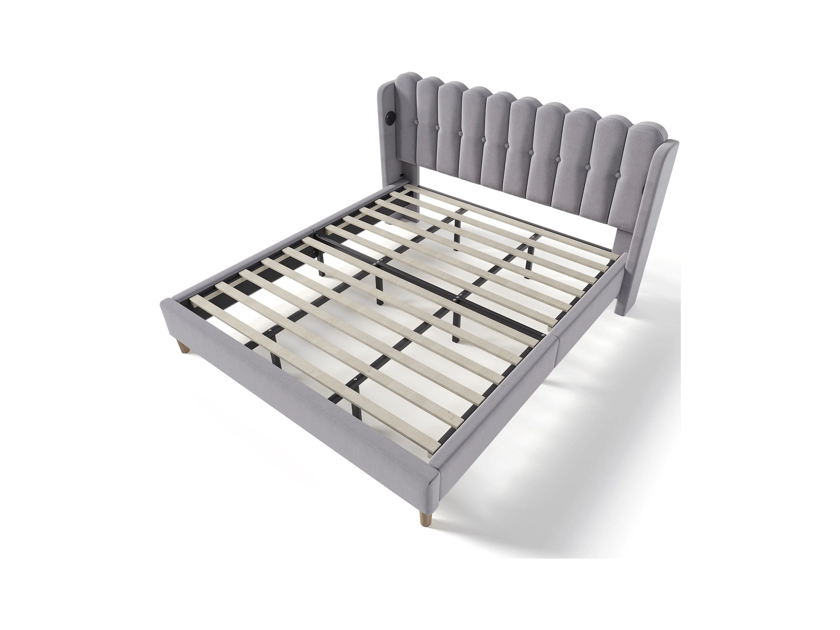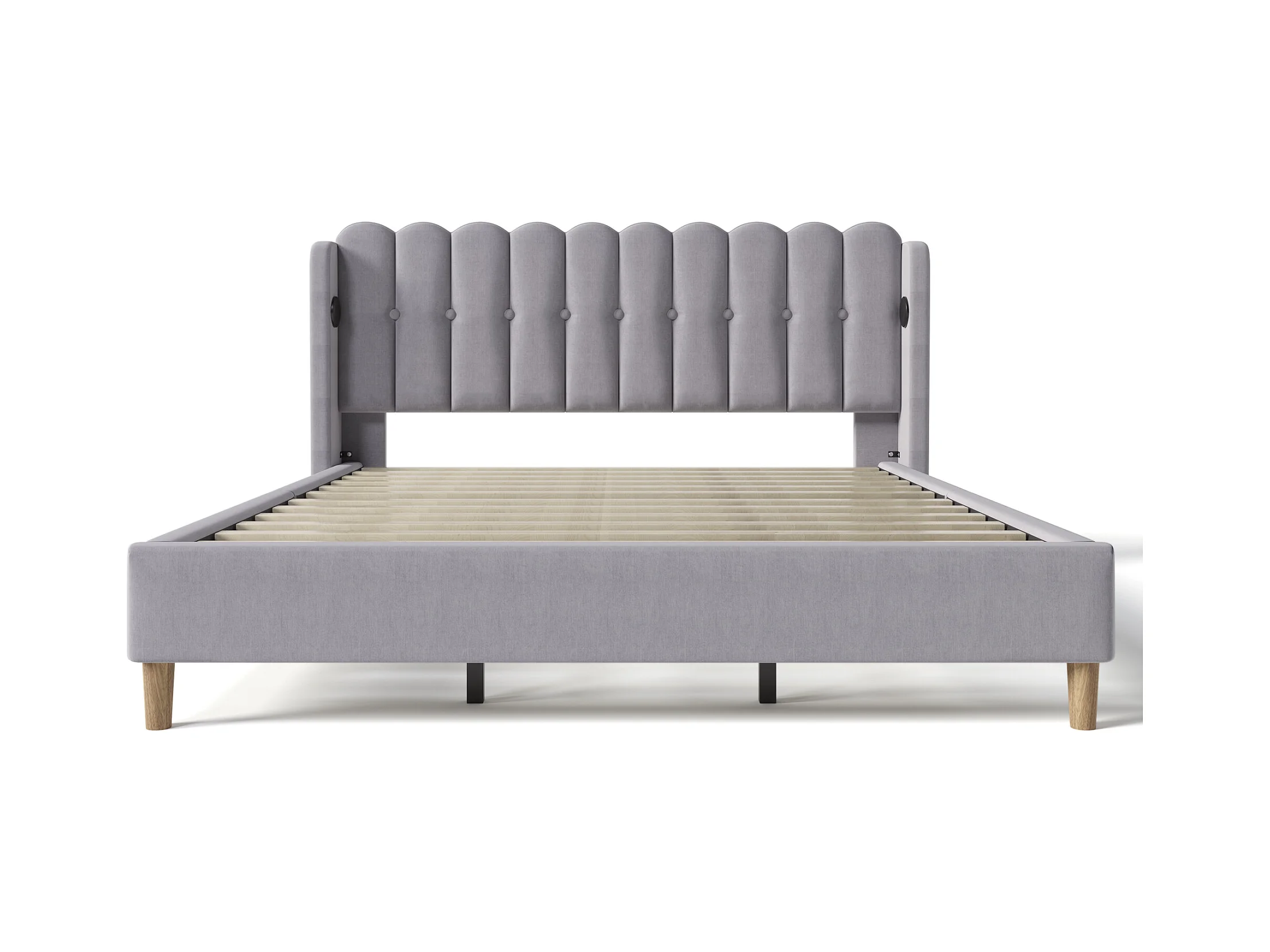 Lit adulte 180x200cm avec sommier - tête de lit capitonnée avec USB - cadre de lit en bois - lin gris (sans matelas)