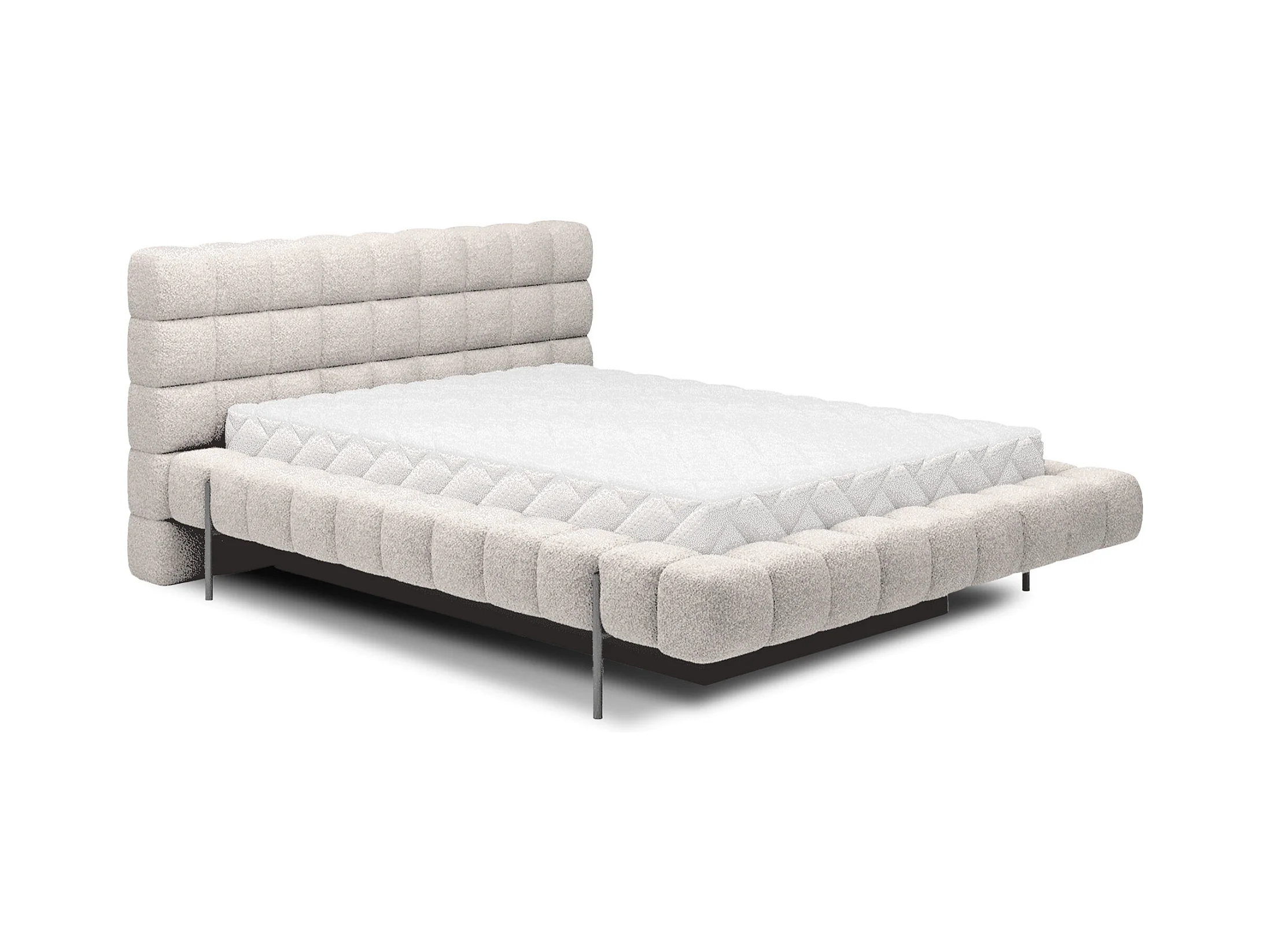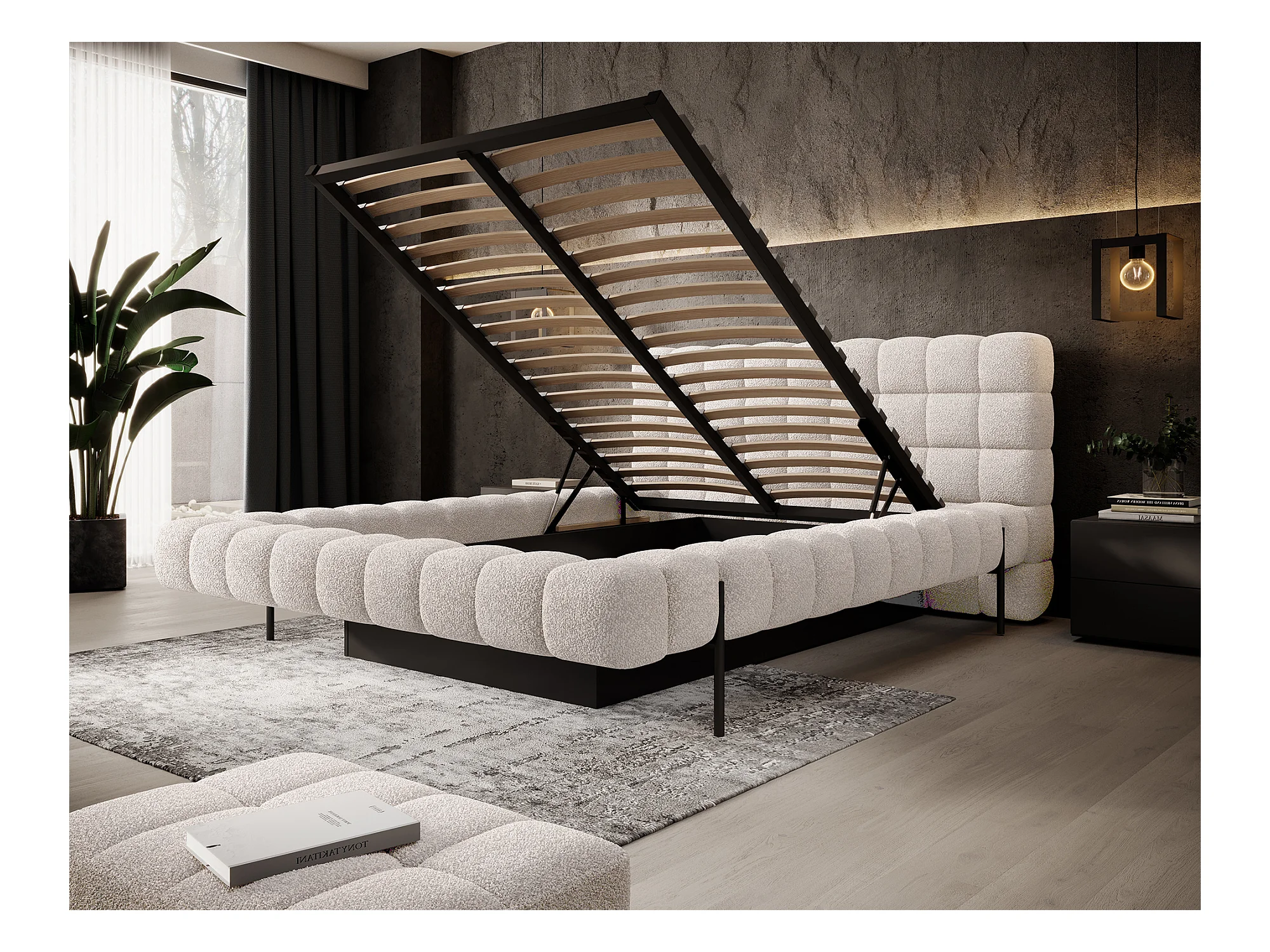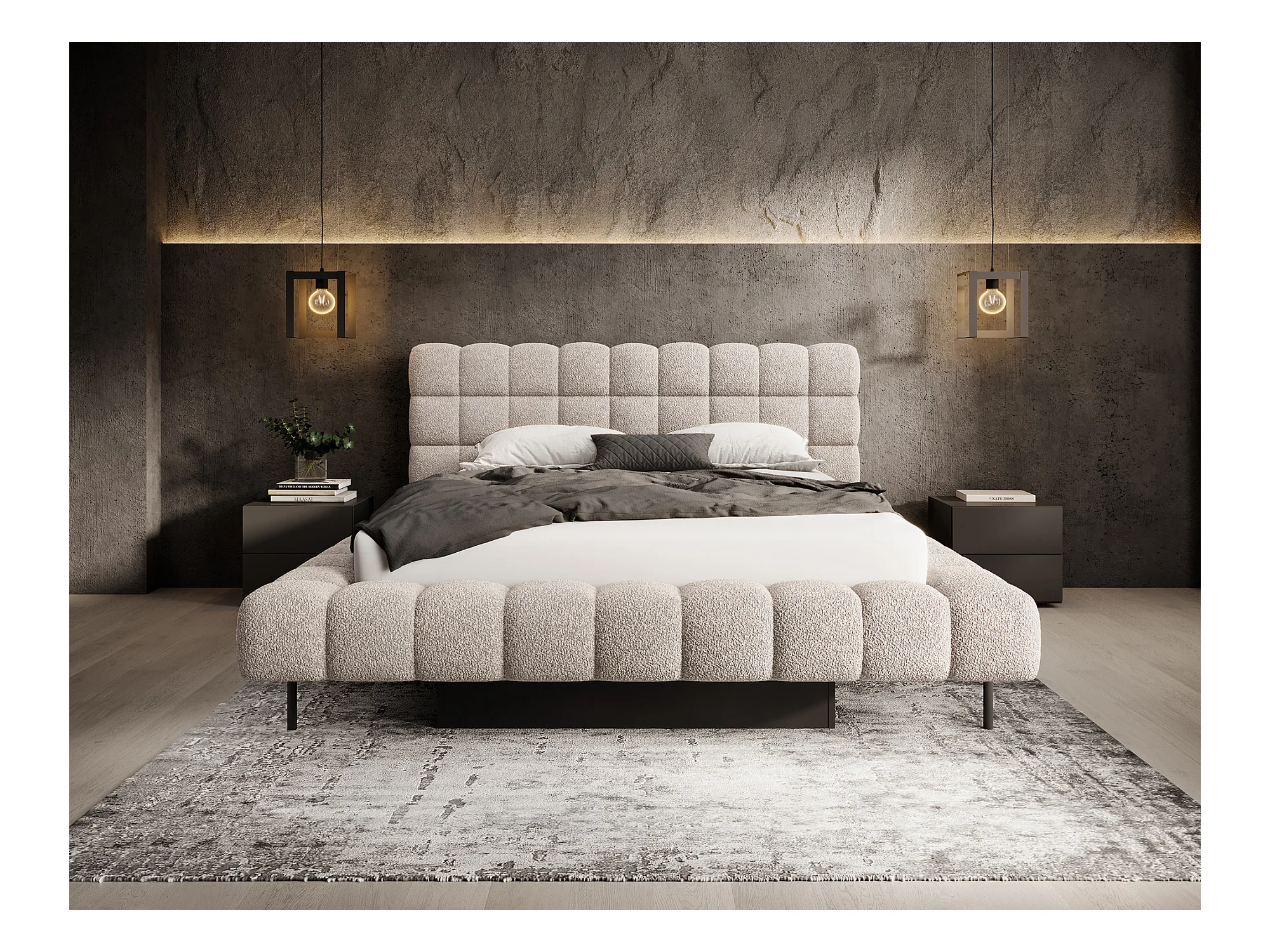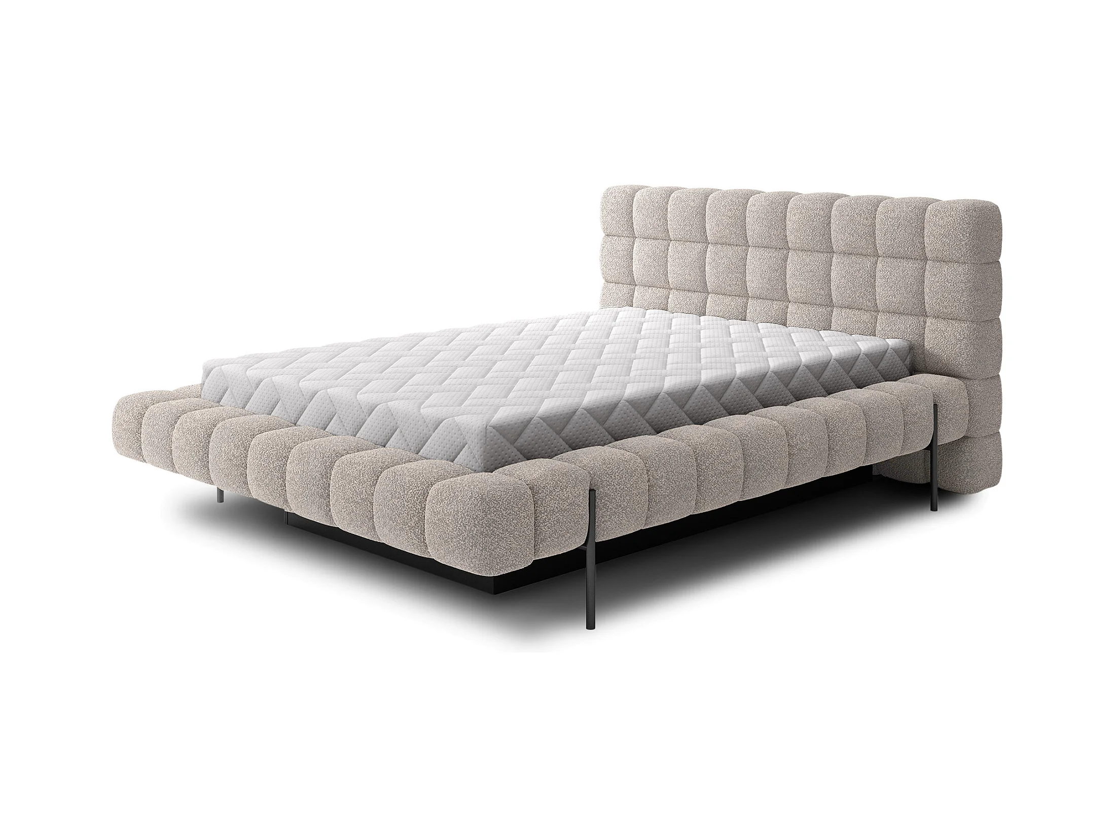 Lit coffre tissu beige chiné grand carré capitonné Berlino-140x200