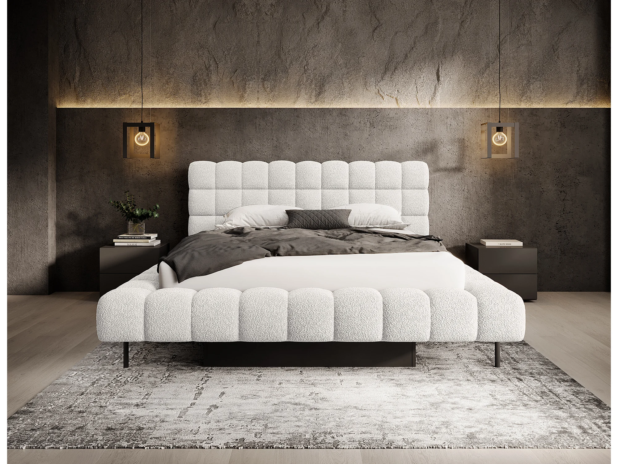 Lit coffre design avec capitonnage tissu à bouclettes Kaizer-Couleur Blanc-160x200