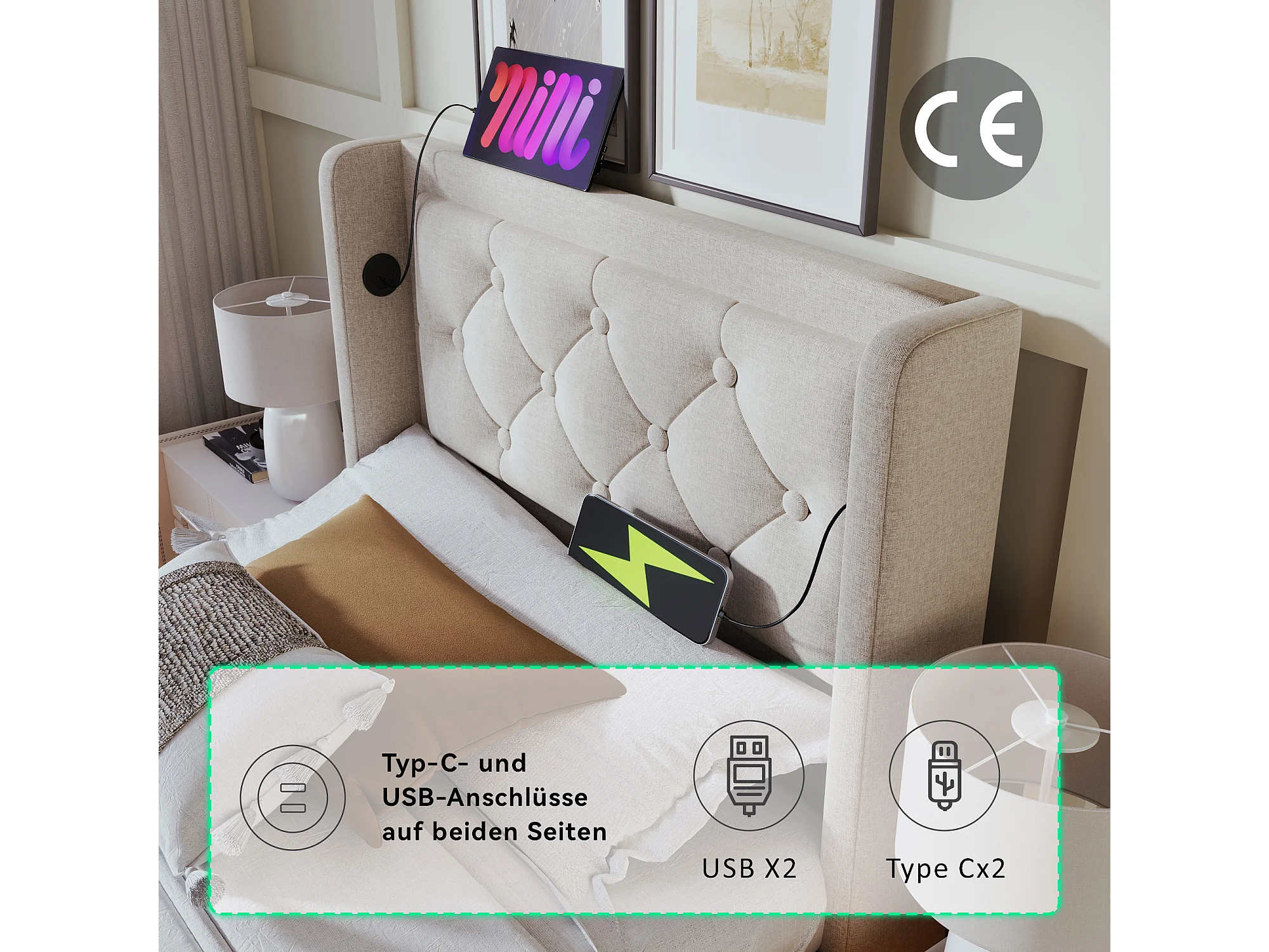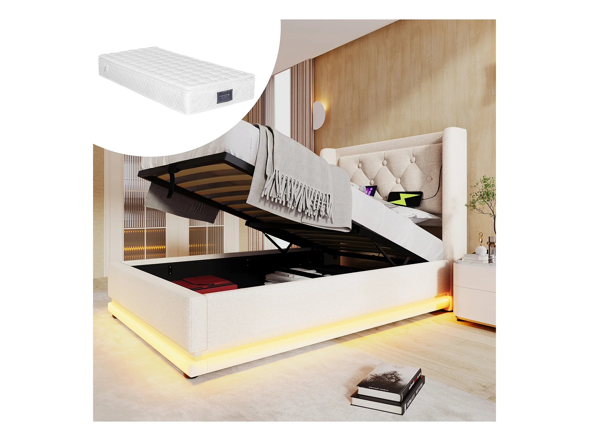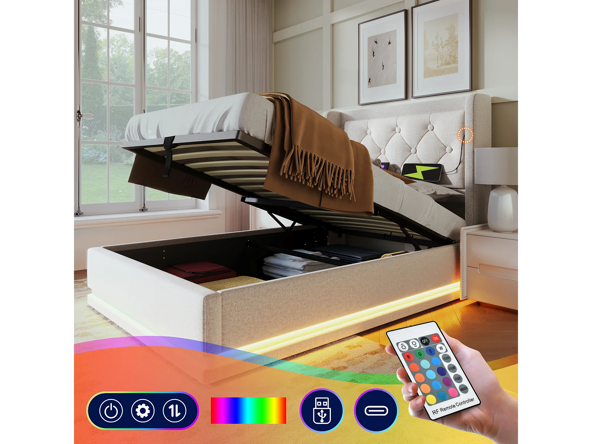 Lit avec LED 3 côtés et Tête de Lit Rembourrée, Lit 90x200 cm, Tissu Coton Beige, Rangement Hydraulique, Fonction USB-C (210x100x101 cm)