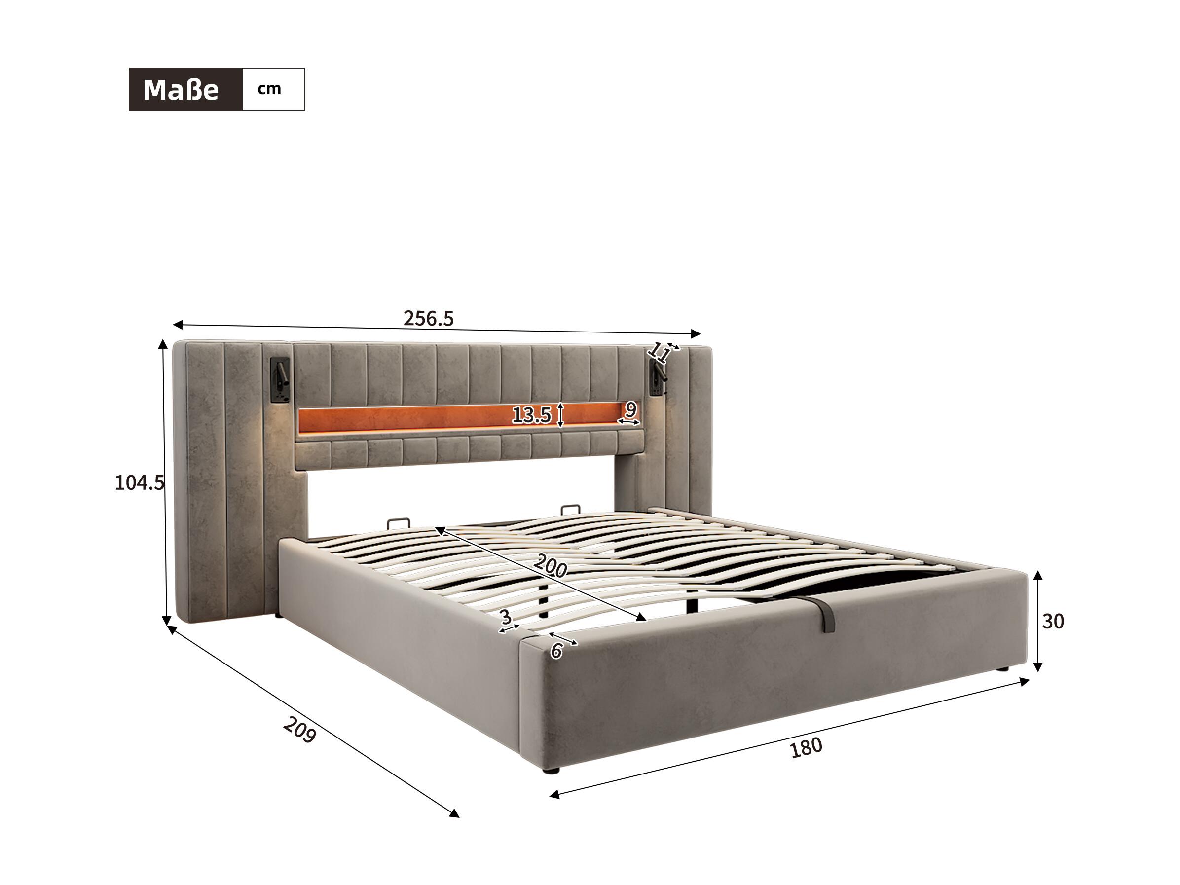 Lit avec LED et USB, avec lampe de chevet, rangement intégré, en velours gris (180x200x95 cm)