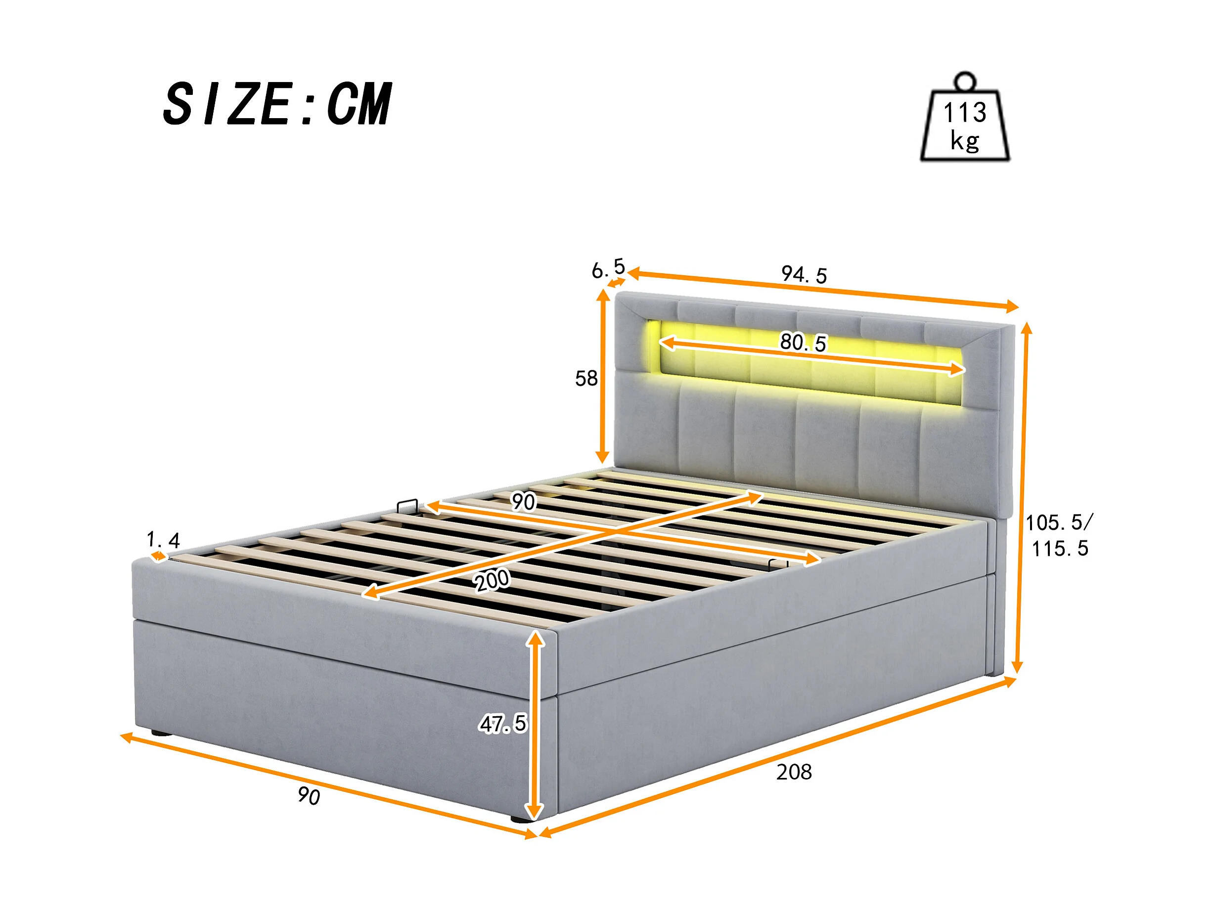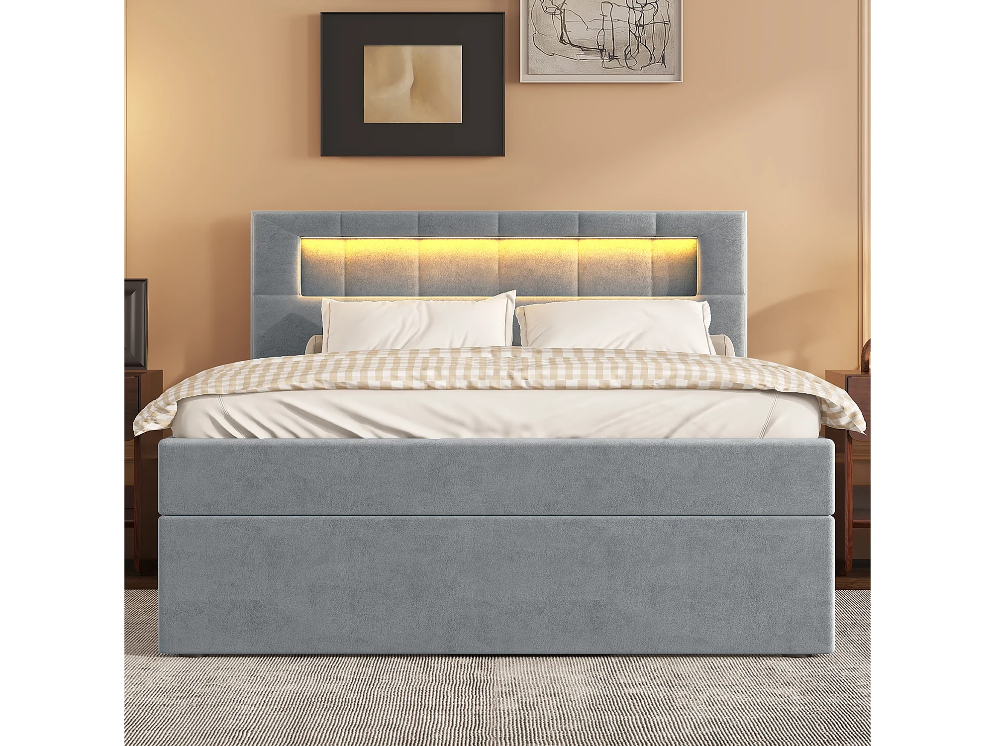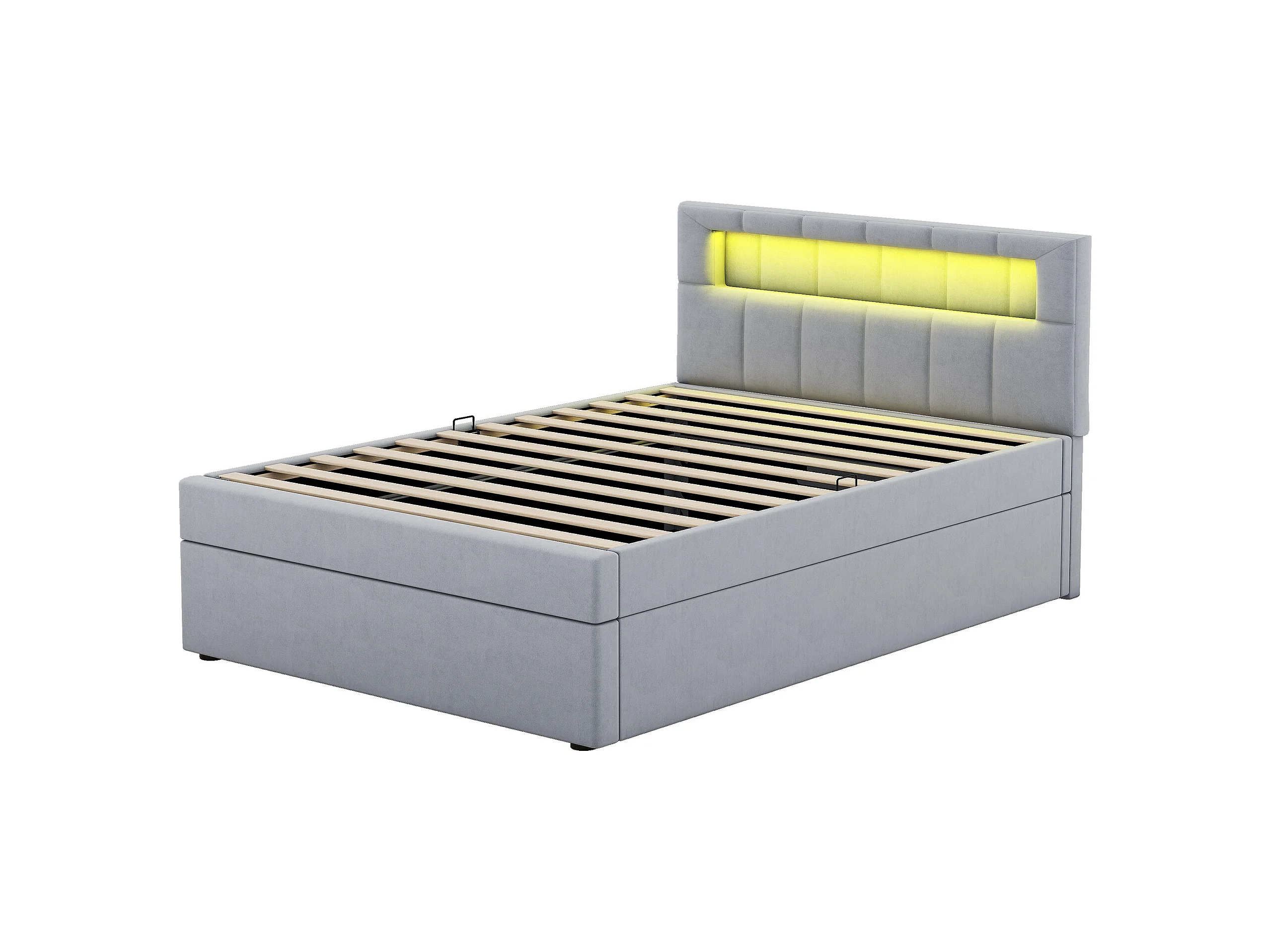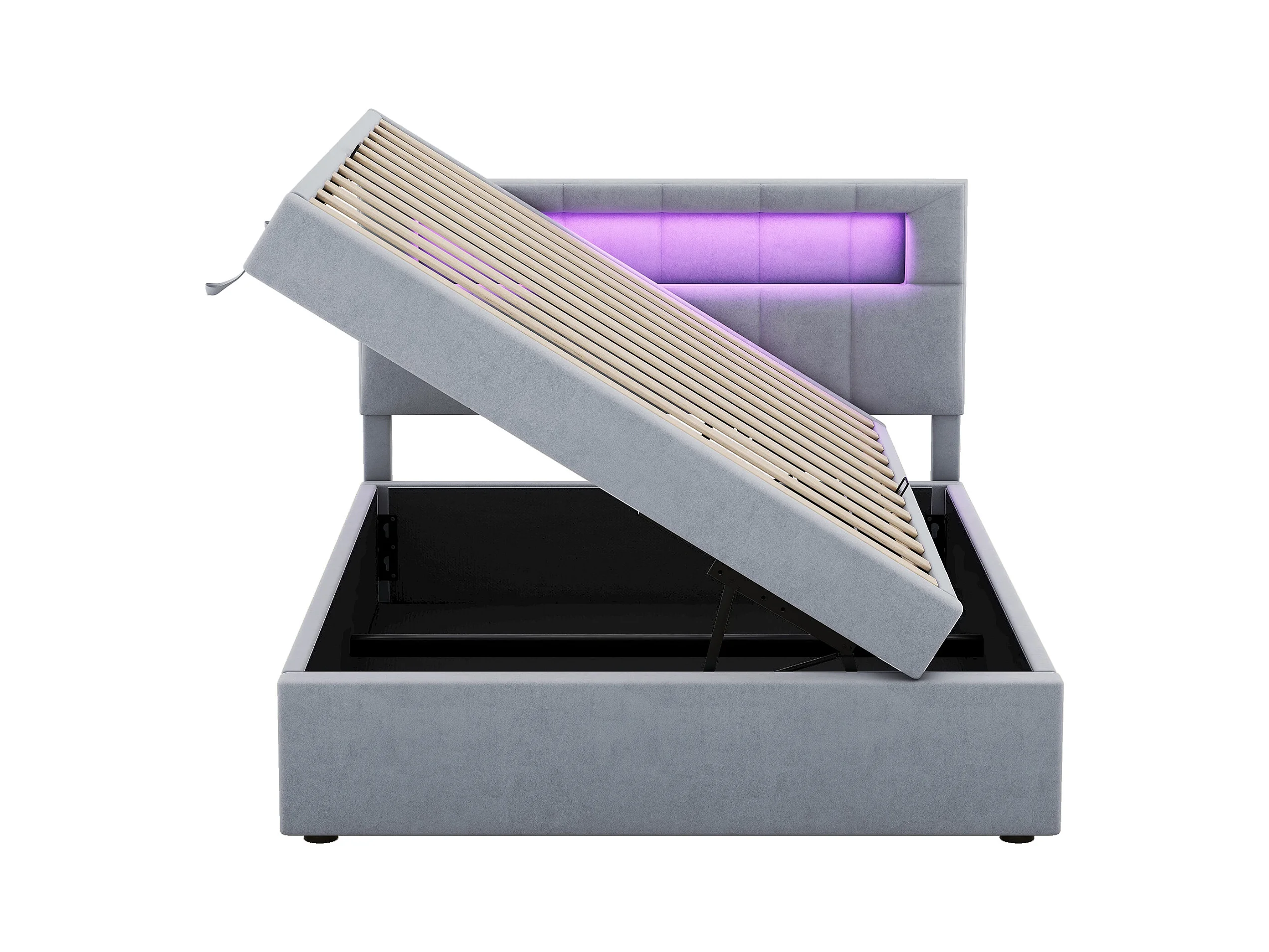 Lit avec rangement et éclairage LED, 90x200 cm, cadre en métal, tissu en velours gris, tête de lit réglable, design minimaliste (208x94.5x115.5 cm)