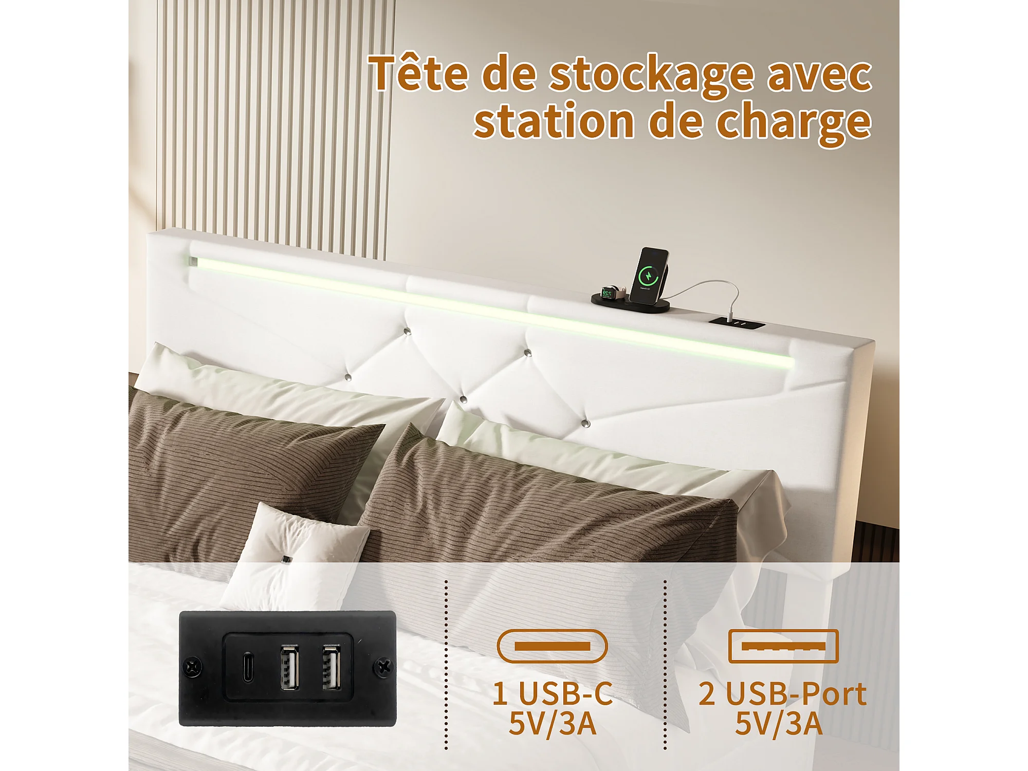 Lit avec rangement et LED 140x200 cm – Tête et pied de lit avec éclairage LED – Revêtement en lin beige – USB chargeur intégré – Confort et design moderne