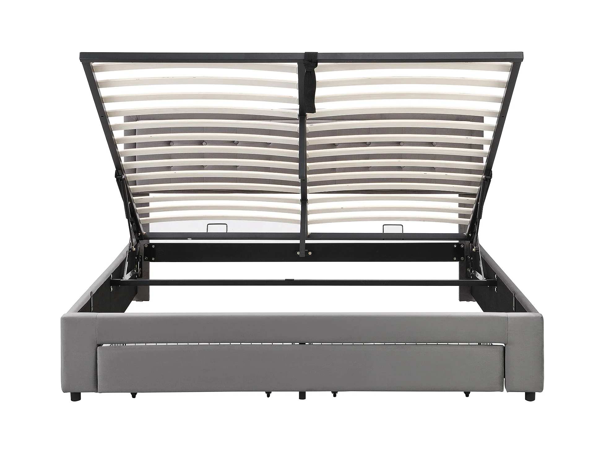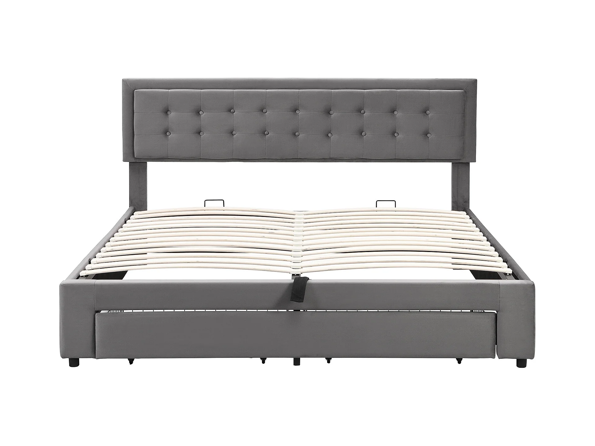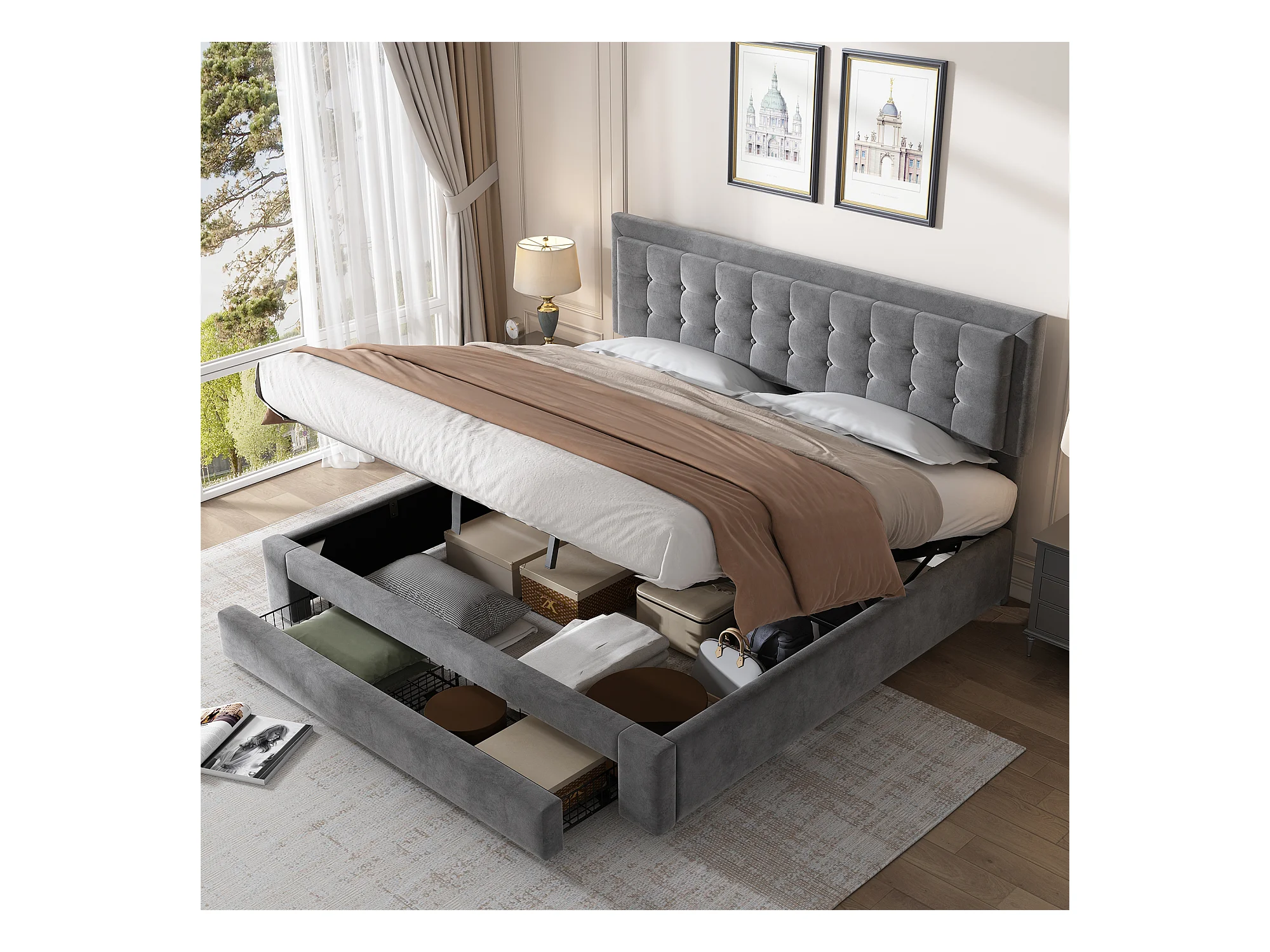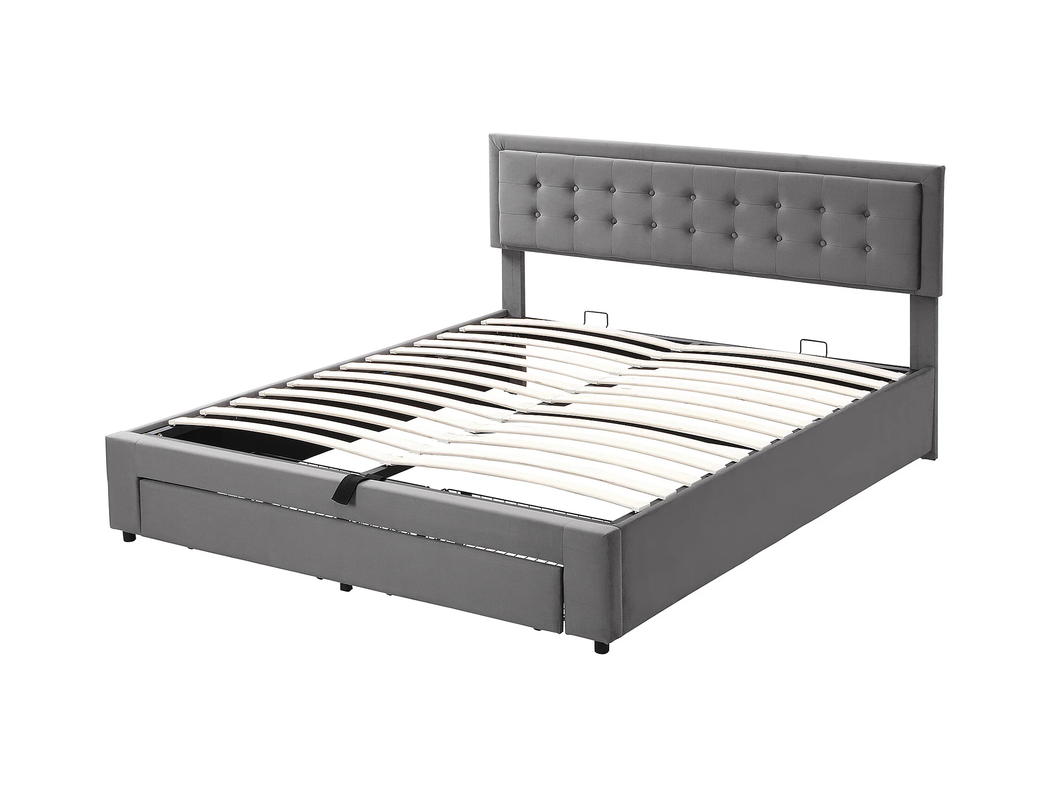 Lit avec rangement, tête de lit capitonnée, velours, gris, 160x200 cm