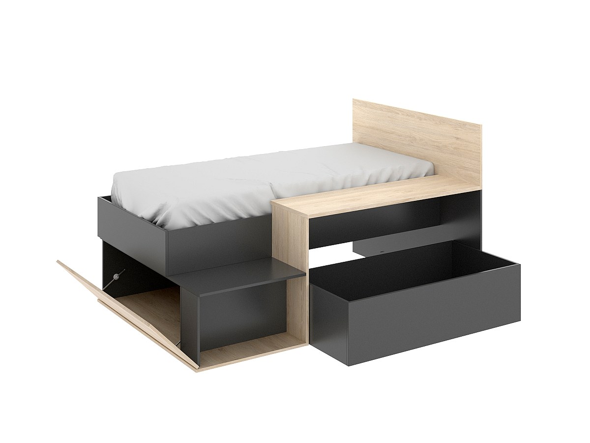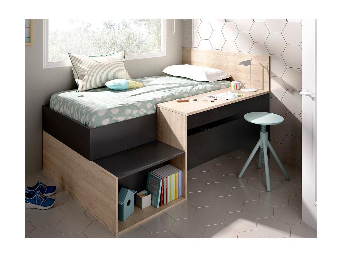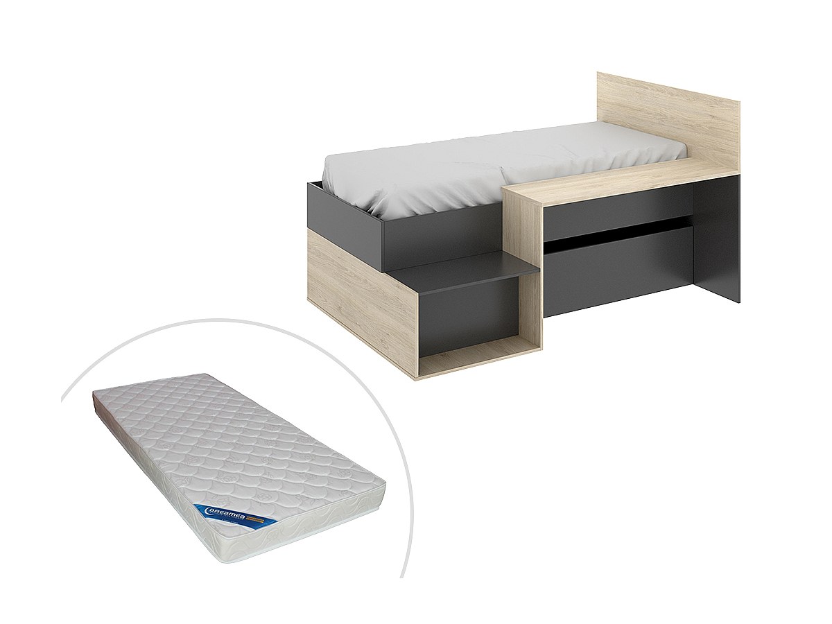 Lit avec rangements et bureau LISON - 90 x 190 cm - Coloris : anthracite et chêne + Matelas