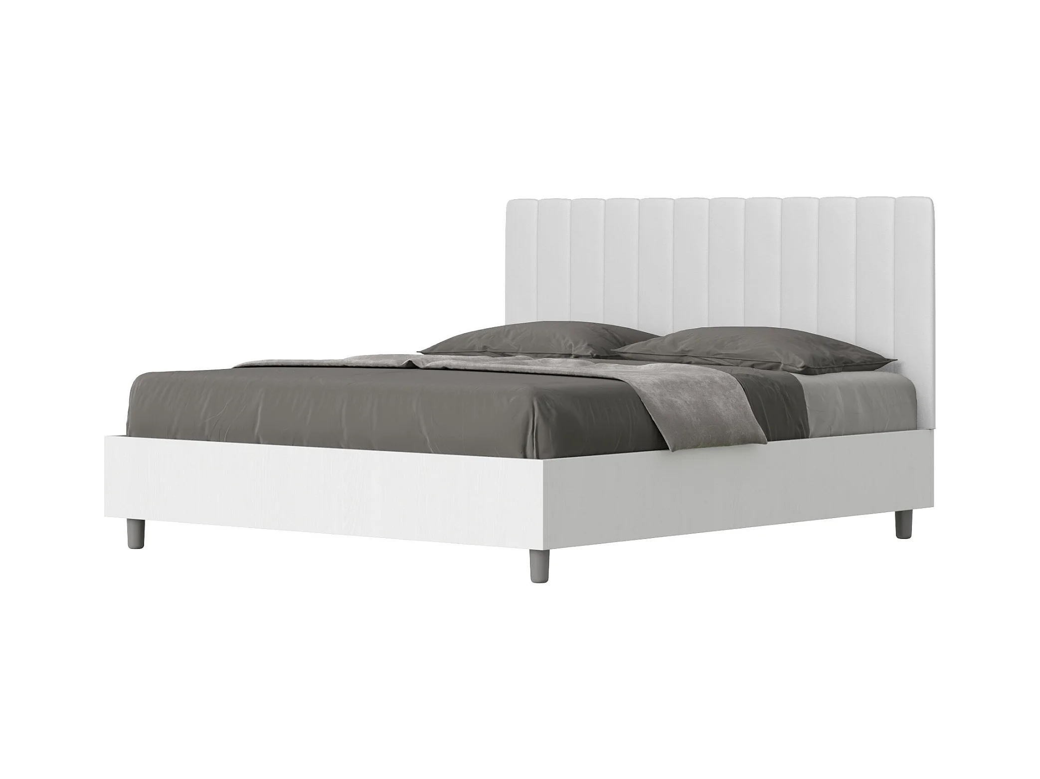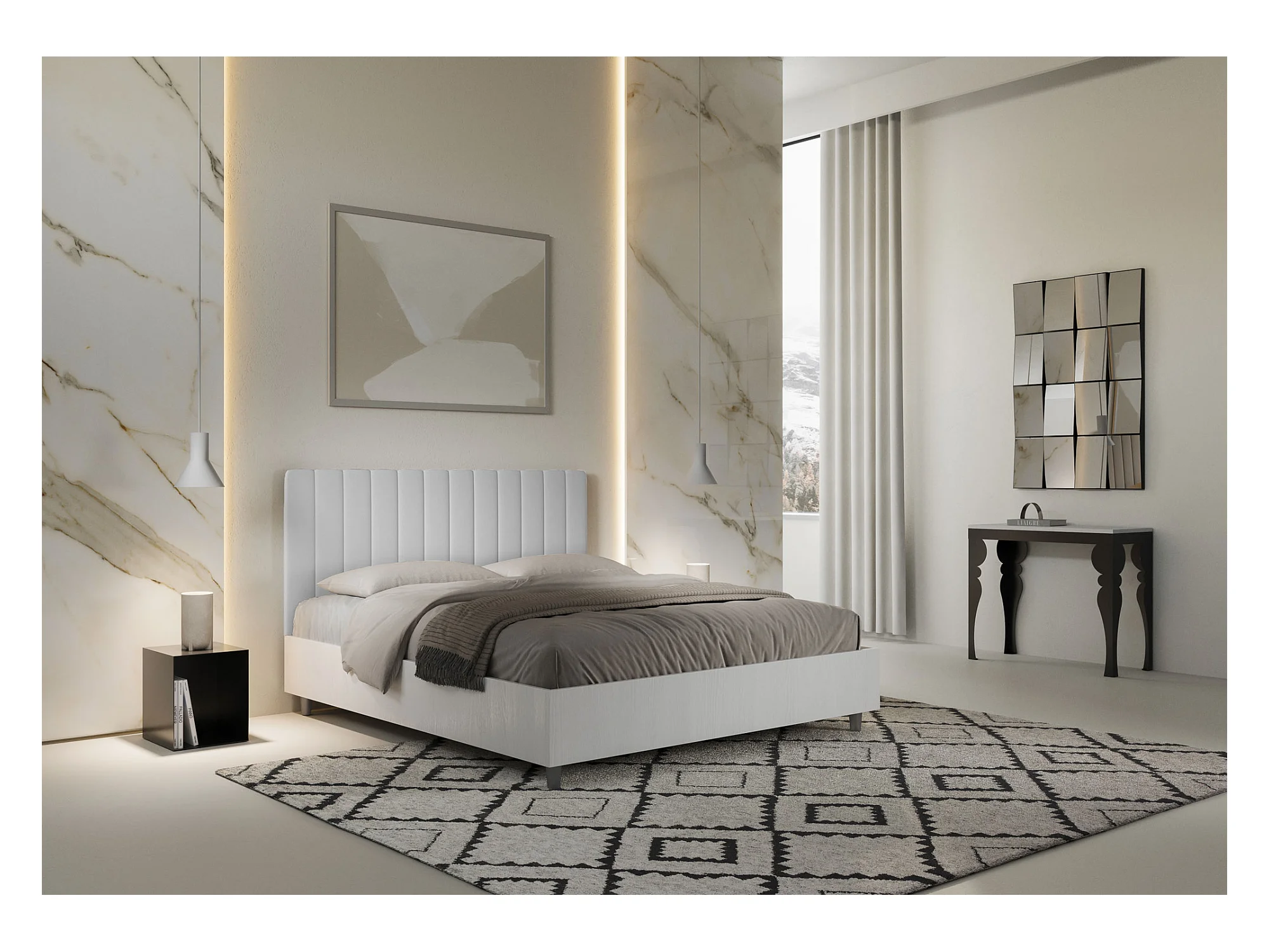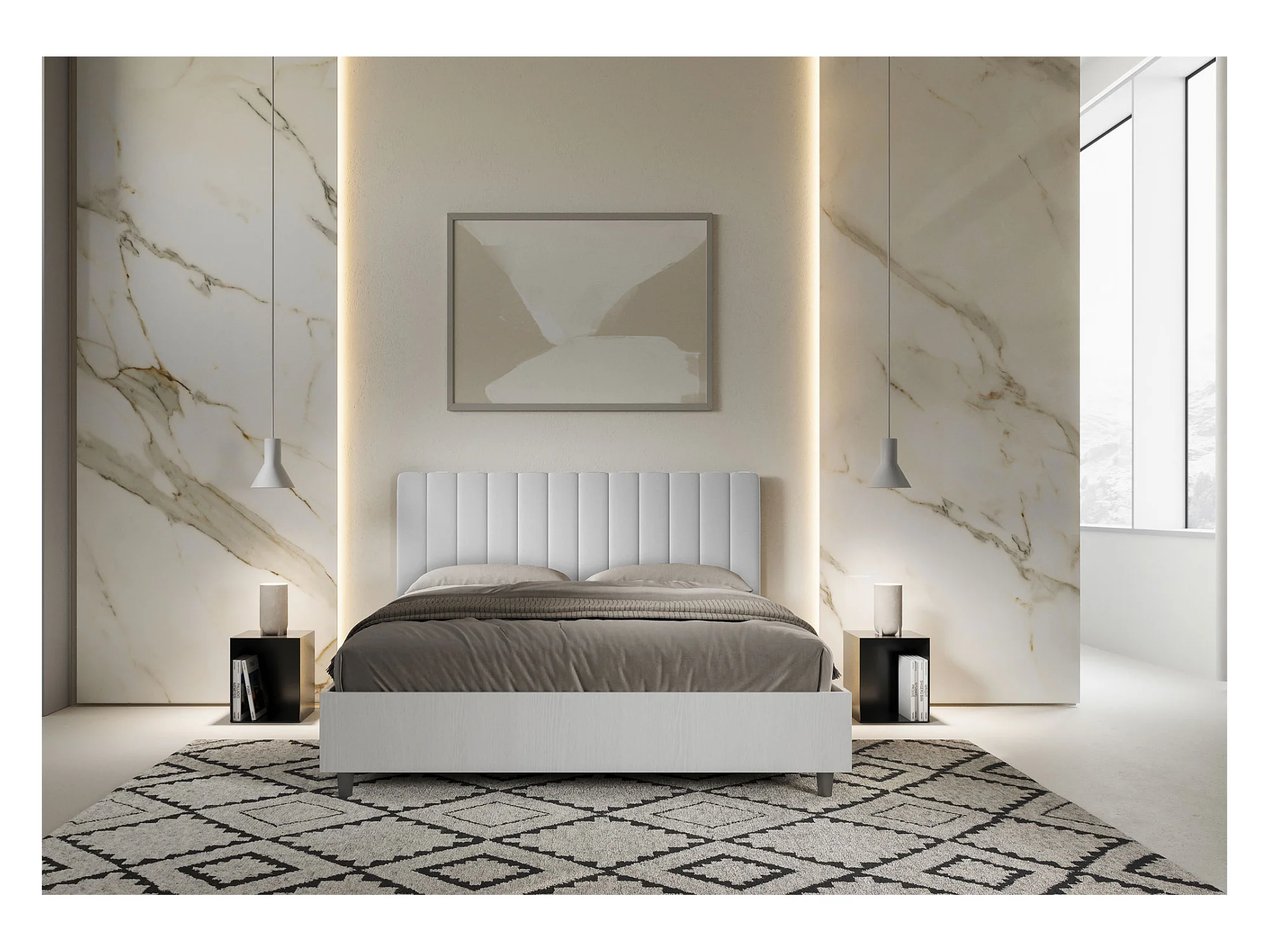 Lit avec sommier 160x190 structure frêne blanc tête de lit similicuir blanc Kaia
