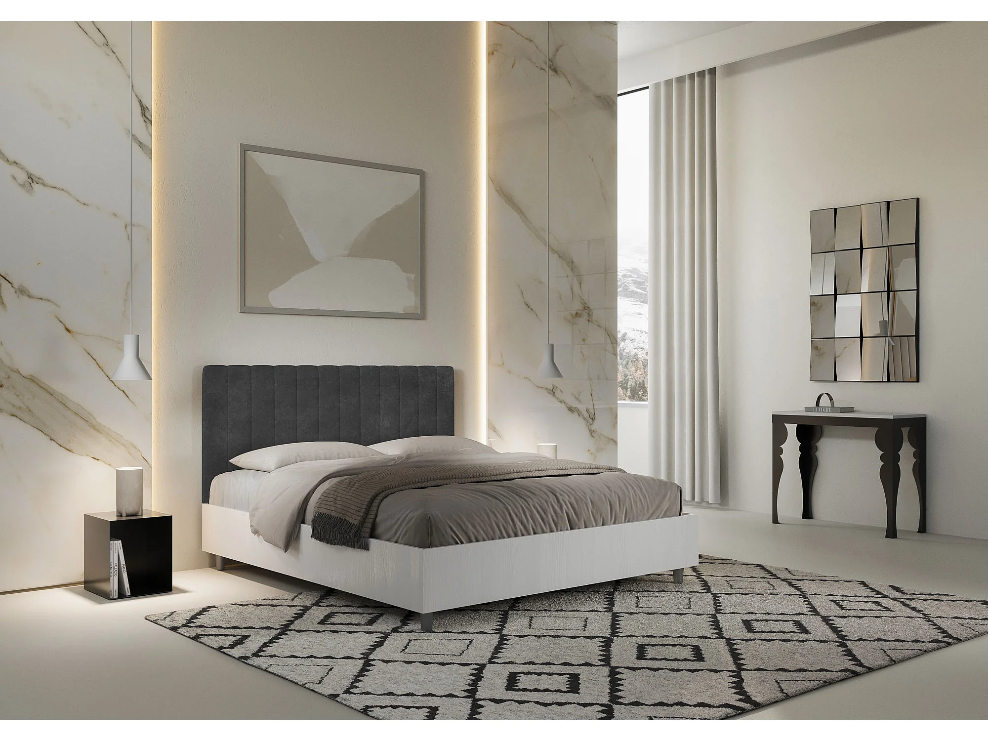 Lit avec sommier 160x200 structure frêne blanc tête de lit microfibre gris Kaia