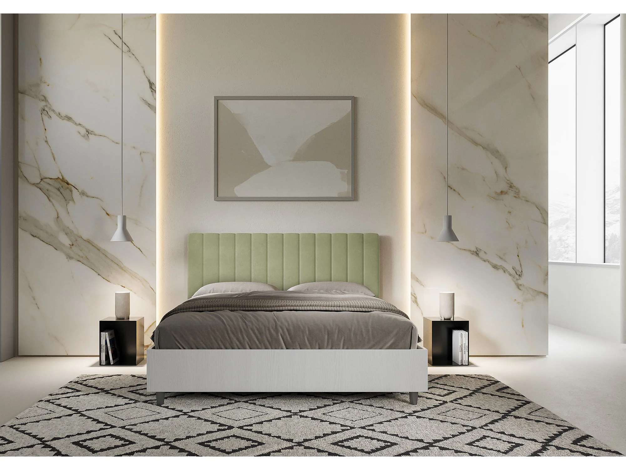 Lit avec sommier 160x200 structure frêne blanc tête de lit microfibre vert Kaia