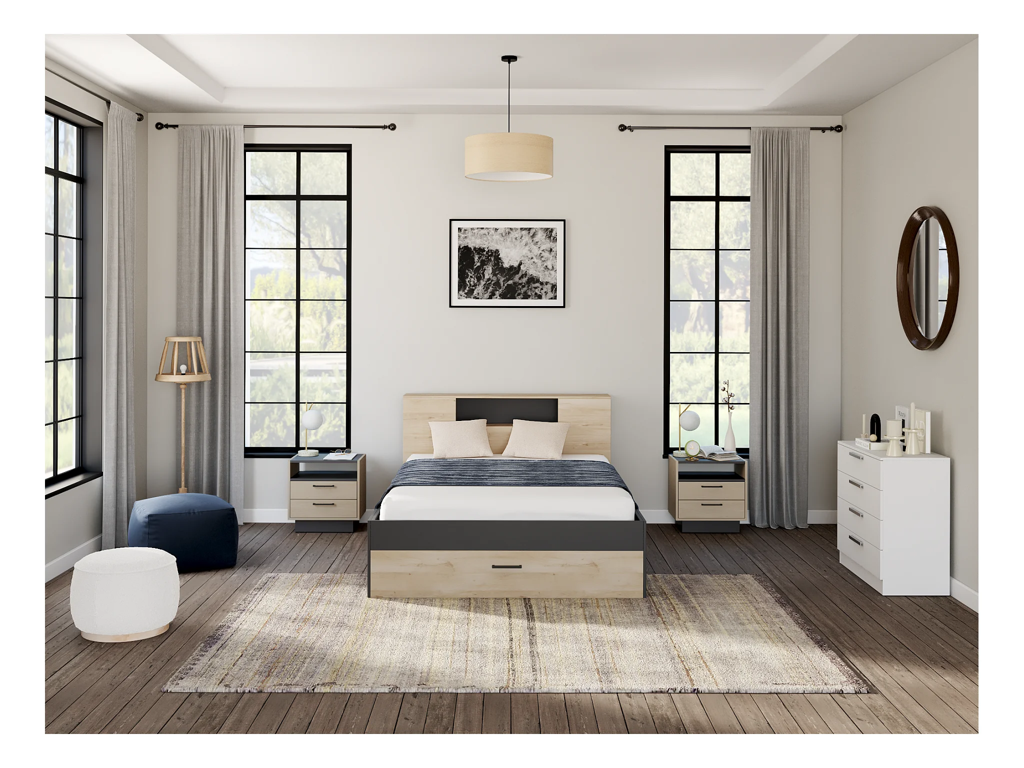 Lit avec tête de lit rangements et tiroirs - 140 x 190 cm - Coloris : Naturel et anthracite + Sommier - LEANDRE