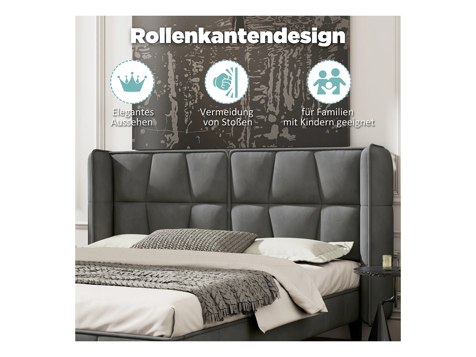 Lit avec tête de lit réglable, 140x200 cm, avec sommier à lattes, design moderne, velours, gris