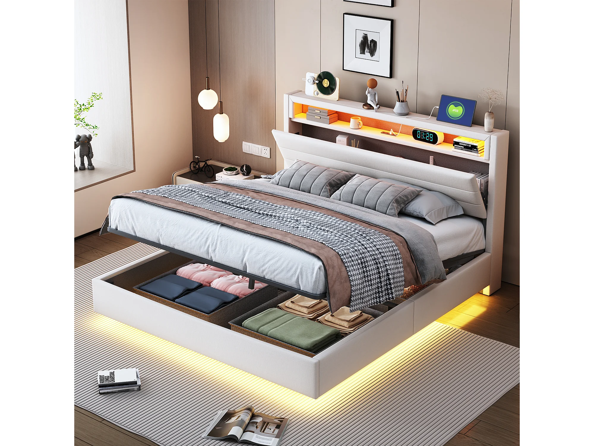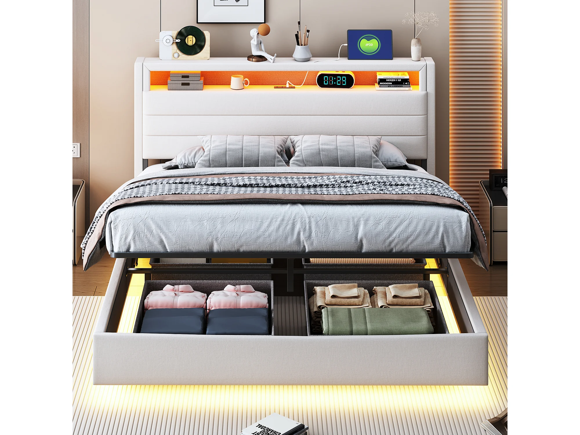 Lit avec tête inclinable 140x200 cm, cadre flottant hydraulique avec rangement, USB et LED, tissu beige (214x141x110 cm)