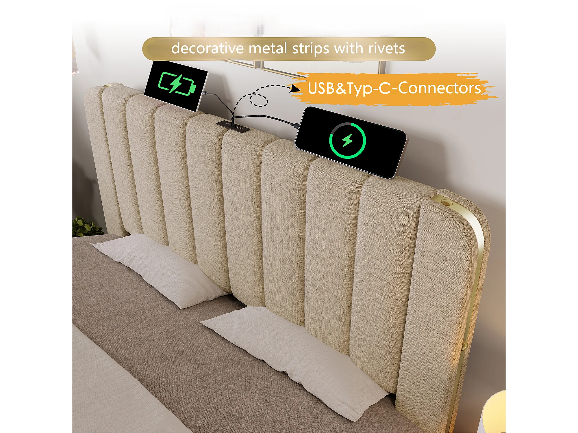 Lit avec tiroirs 90x200cm en tissu lin - avec recharge USB & Type-C - décoré de bandes dorées - Beige