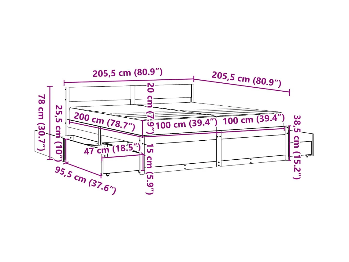 Lit avec tiroirs et matelas blanc 200x200 cm bois massif de pin
