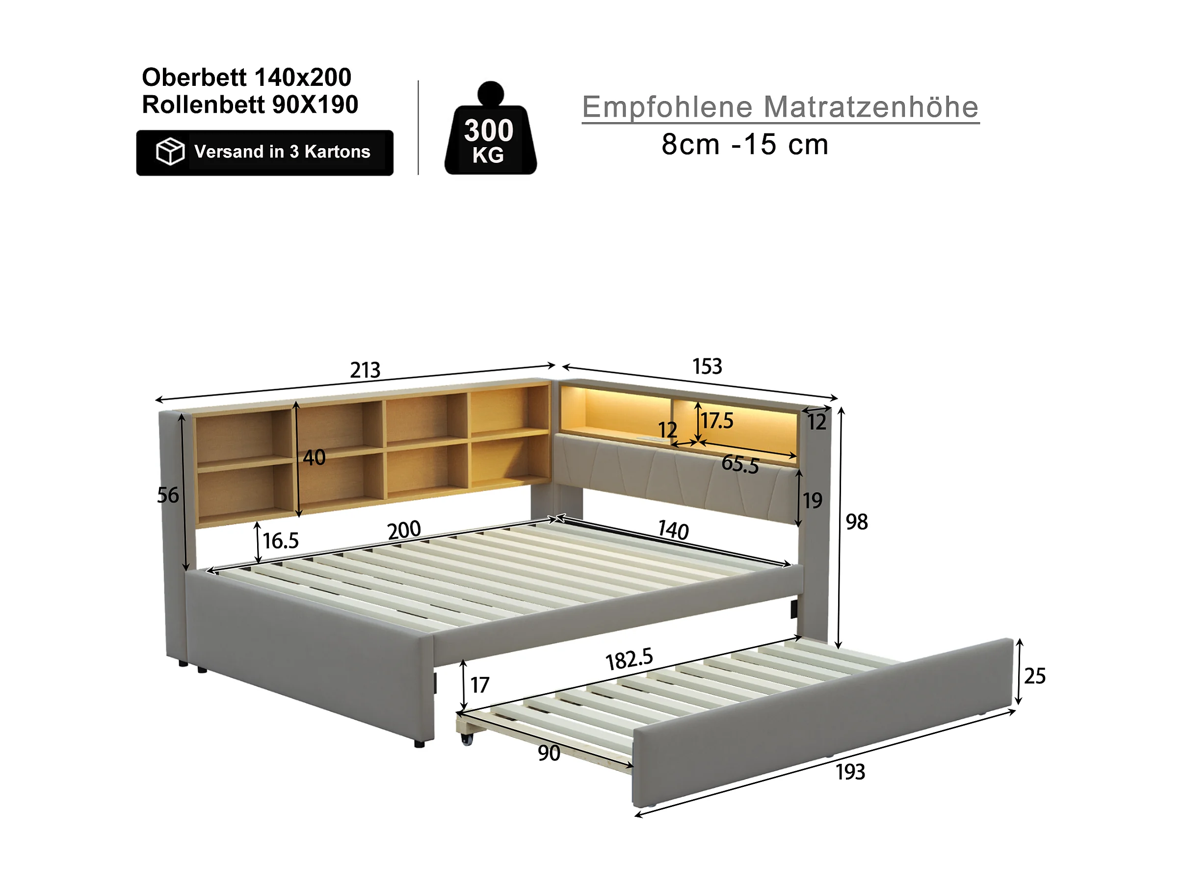 Lit banquette 140 x 200 cm - Lit gigogne 90 x 190 cm avec éclairage LED et nombreux rangements - flanelle gris foncé