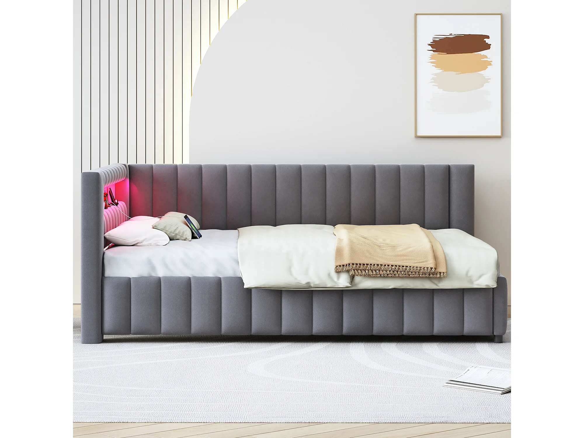 Lit rembourré banquette en velours 140x200cm, Canapé-lit avec LED, USB, dossier et tête de lit, Gris