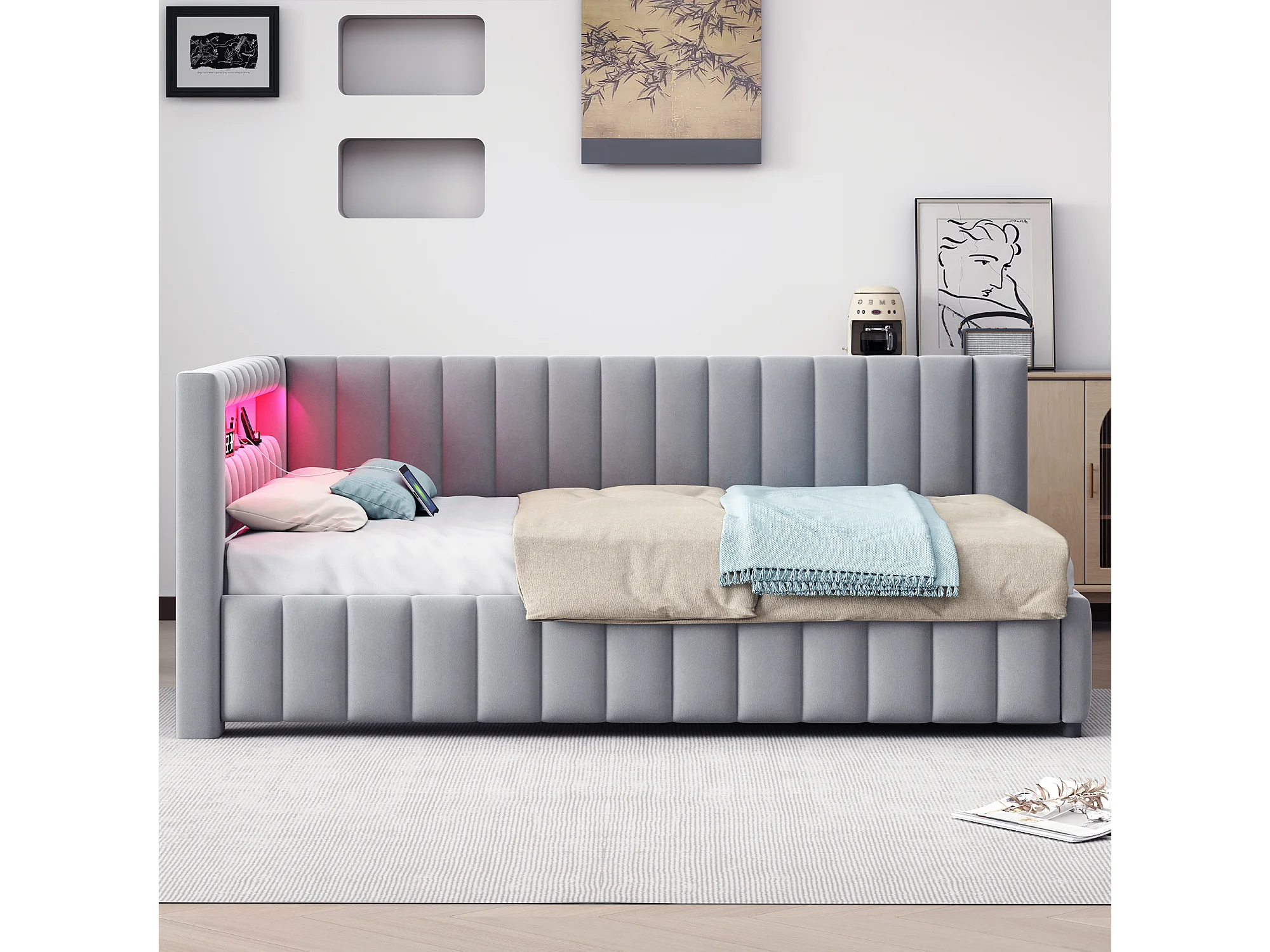 Lit banquette 140x200 cm - velours gris - Lit adulte avec éclairage LED et port de charge USB - sans matelas
