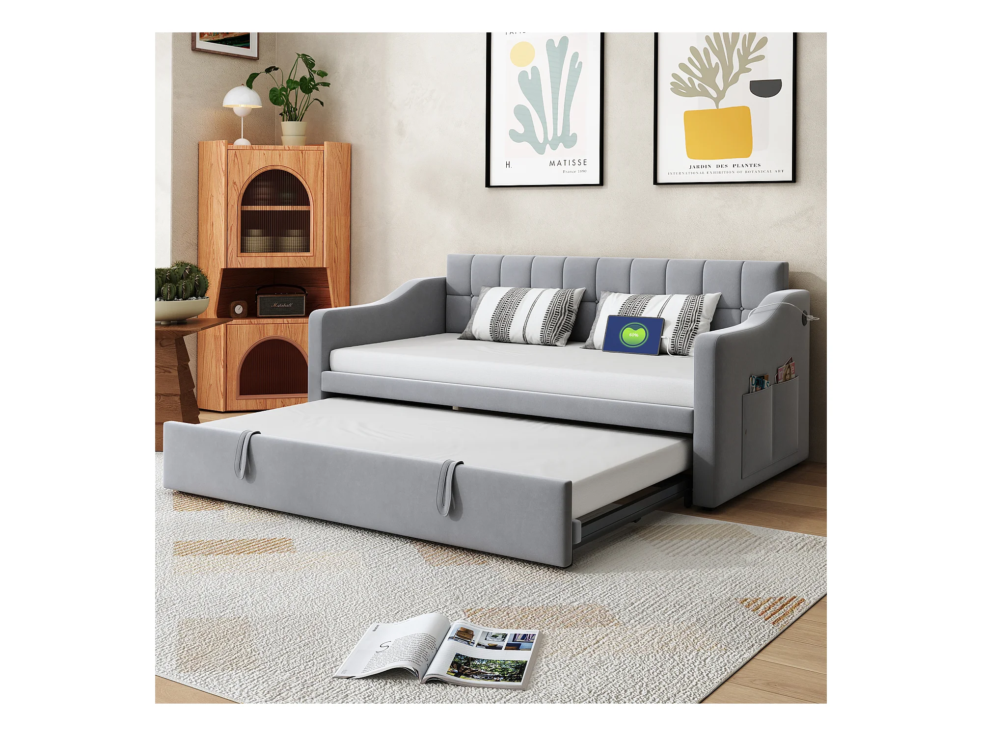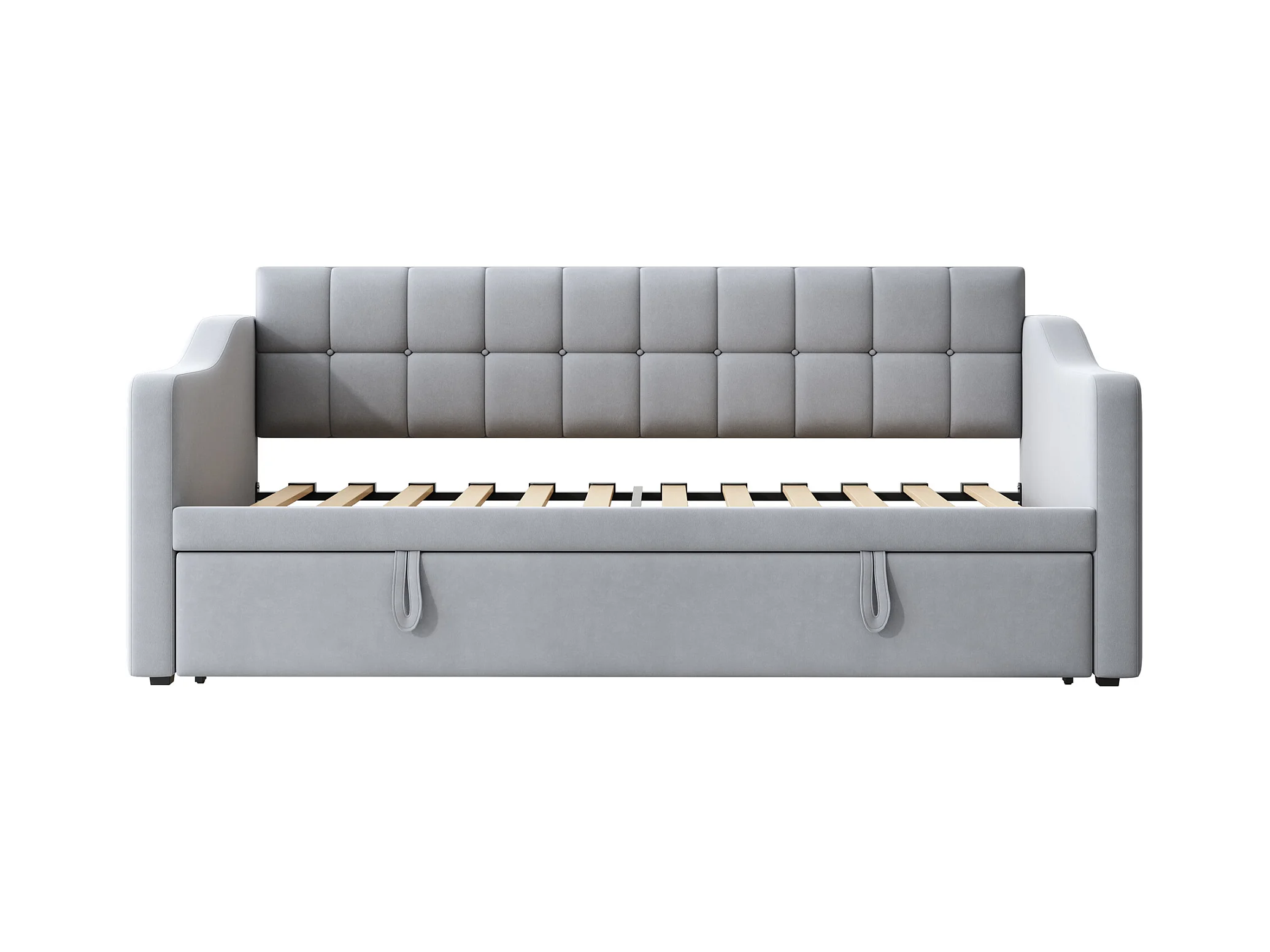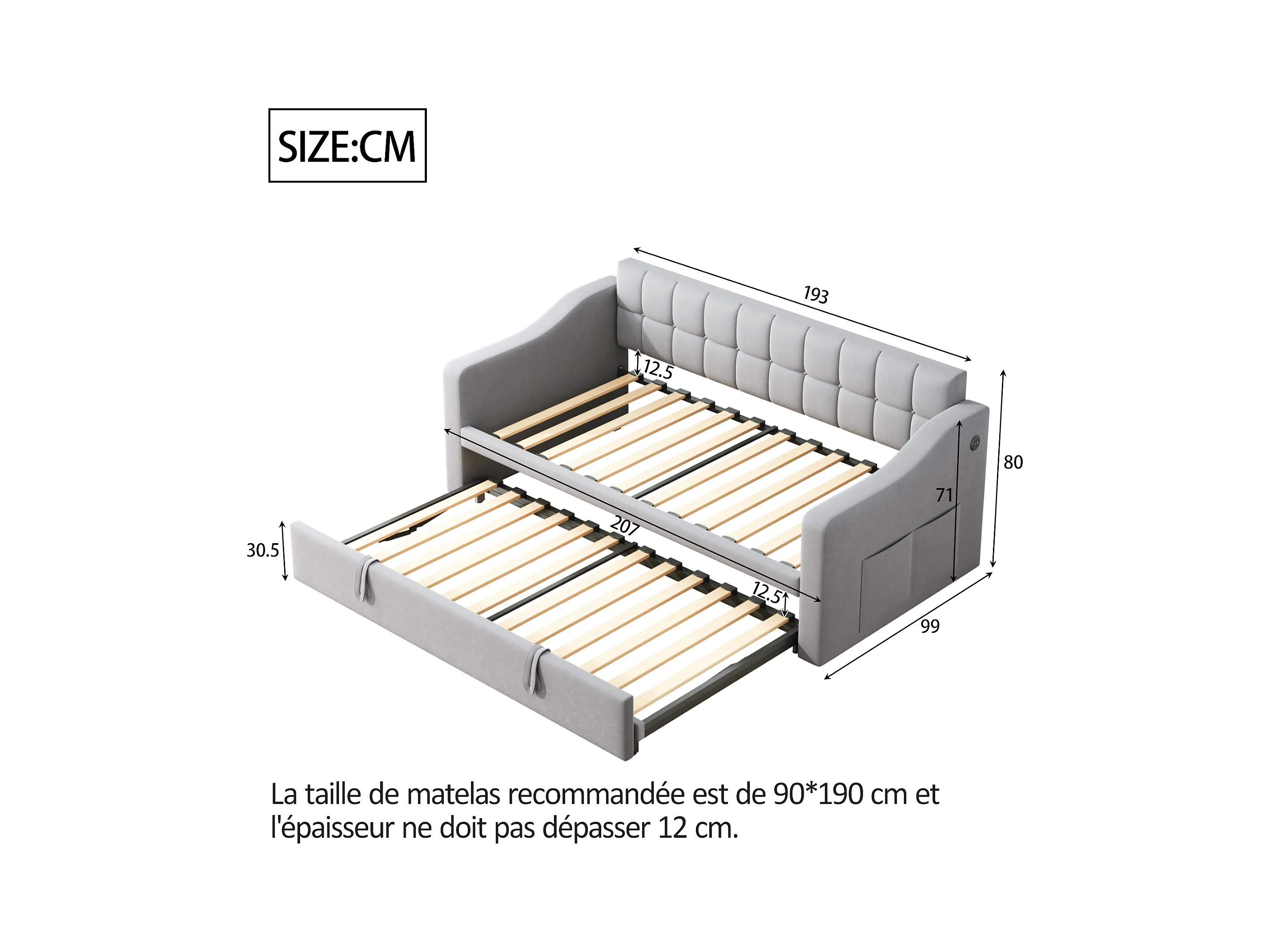 Lit banquette 90/180x190 cm, velours gris clair, avec lit gigogne et prise USB - sans matelas