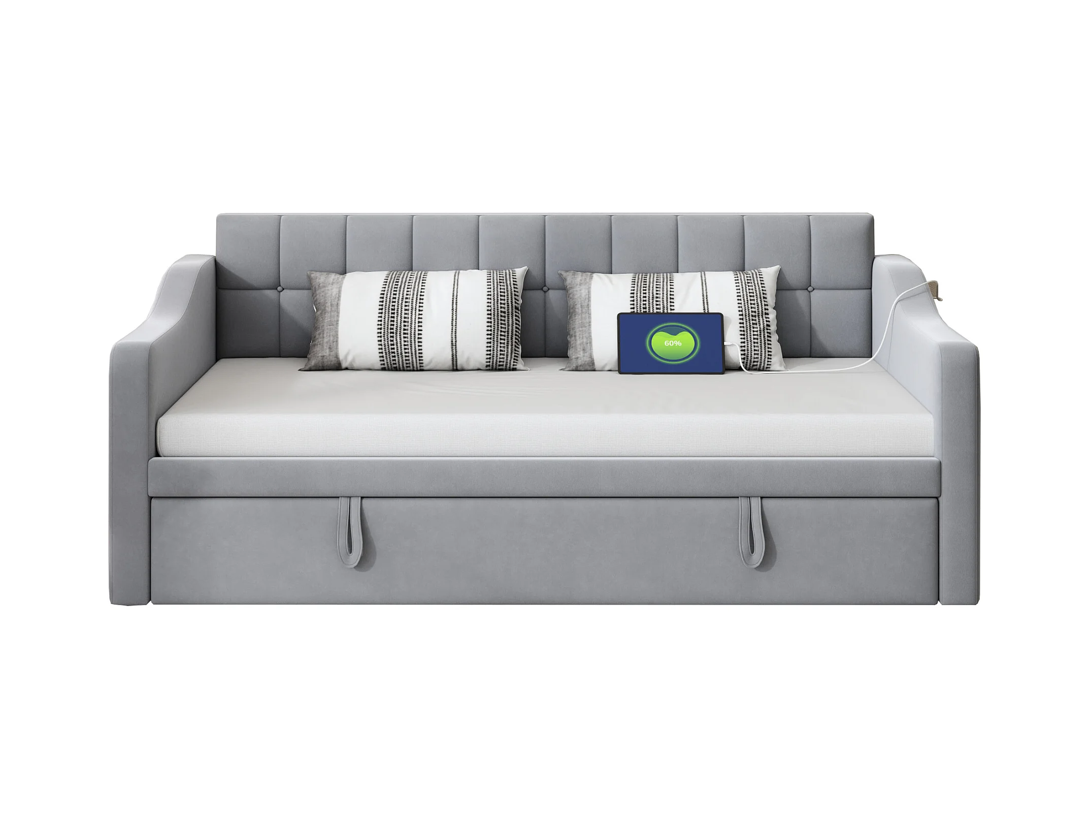 Canapé-lit 90x190 cm - avec lit gigogne - avec ports USB + Type-C - avec 2 tiroirs - bande lumineuse LED - gris (matelas non inclus)