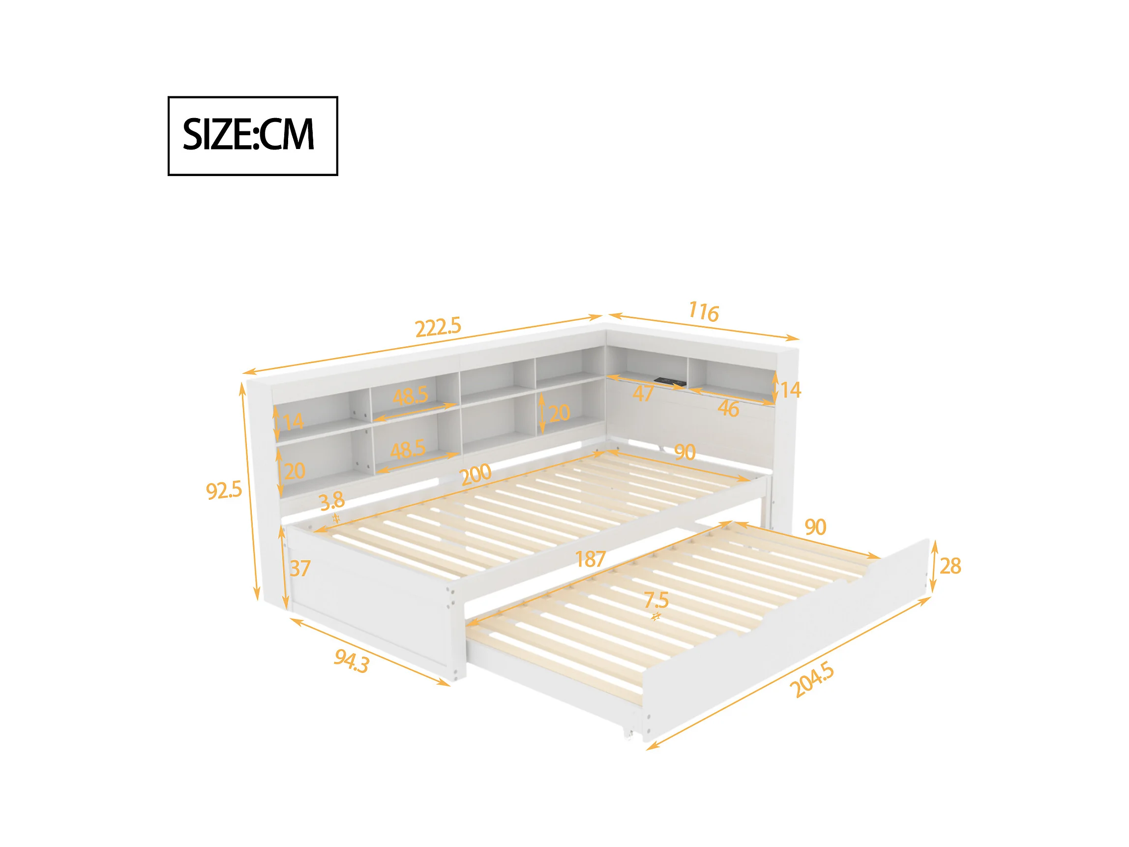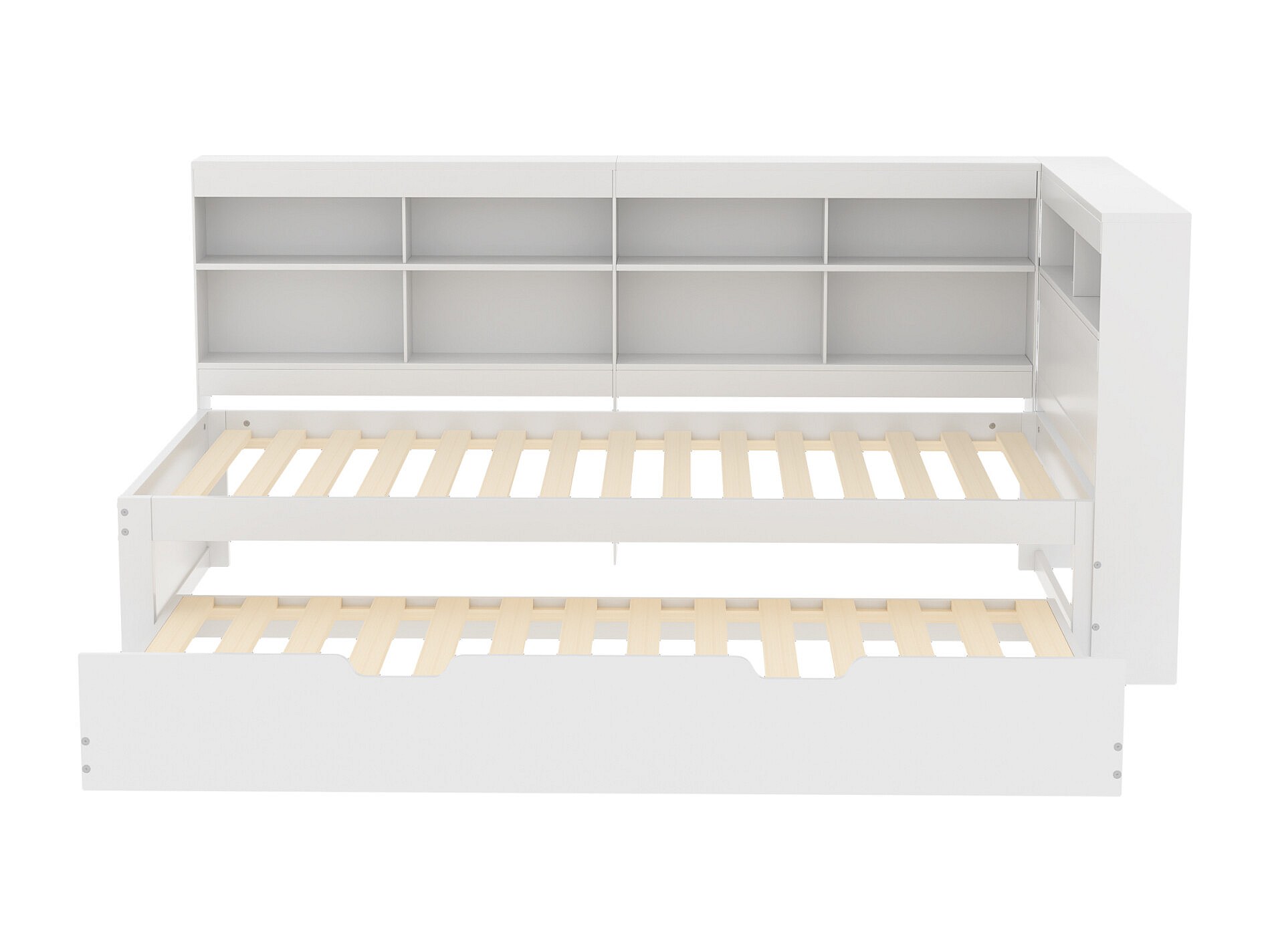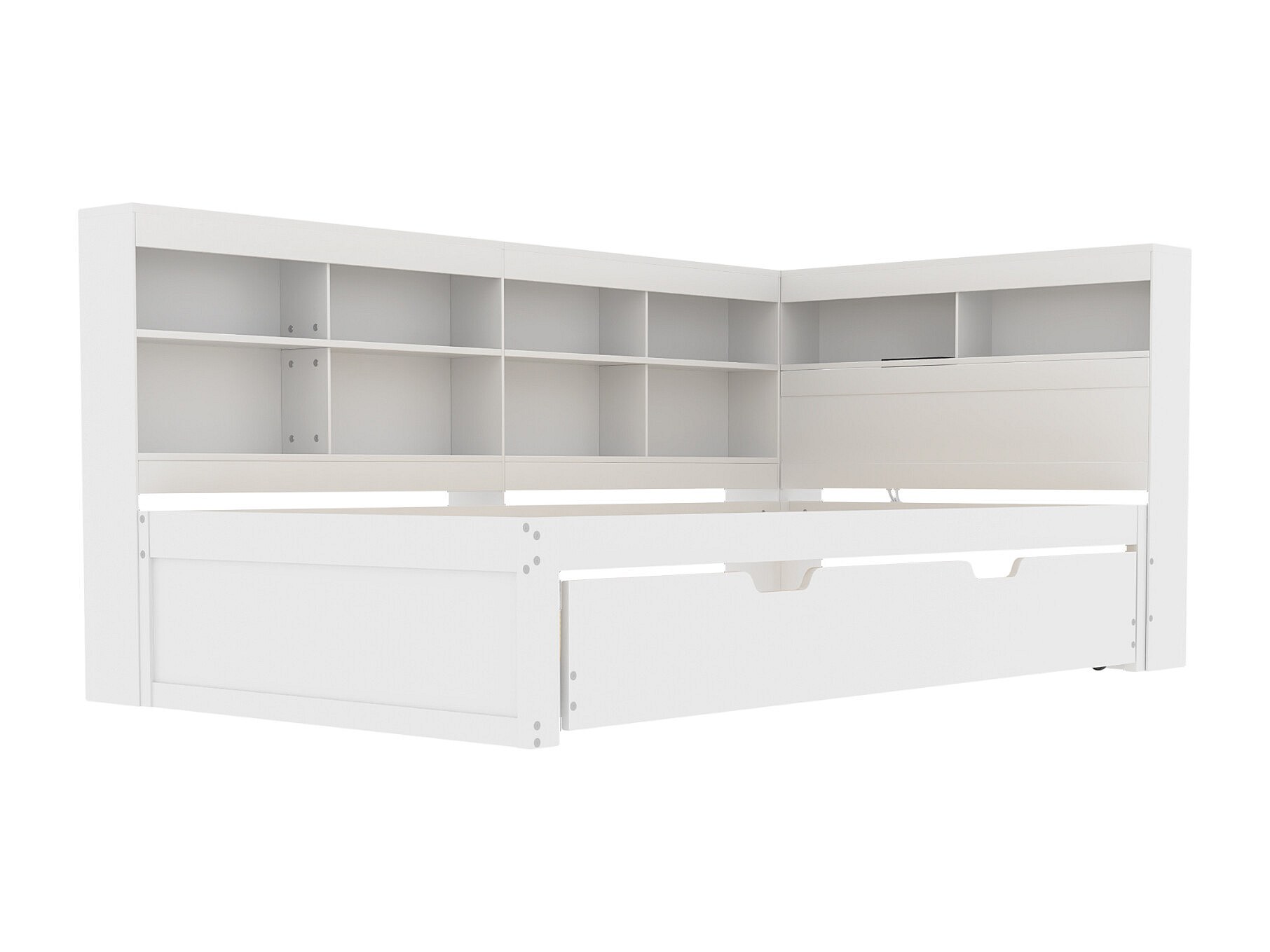 Lit banquette 90x200 cm avec lit gigogne et étagère de rangement, port USB - blanc - sans matelas