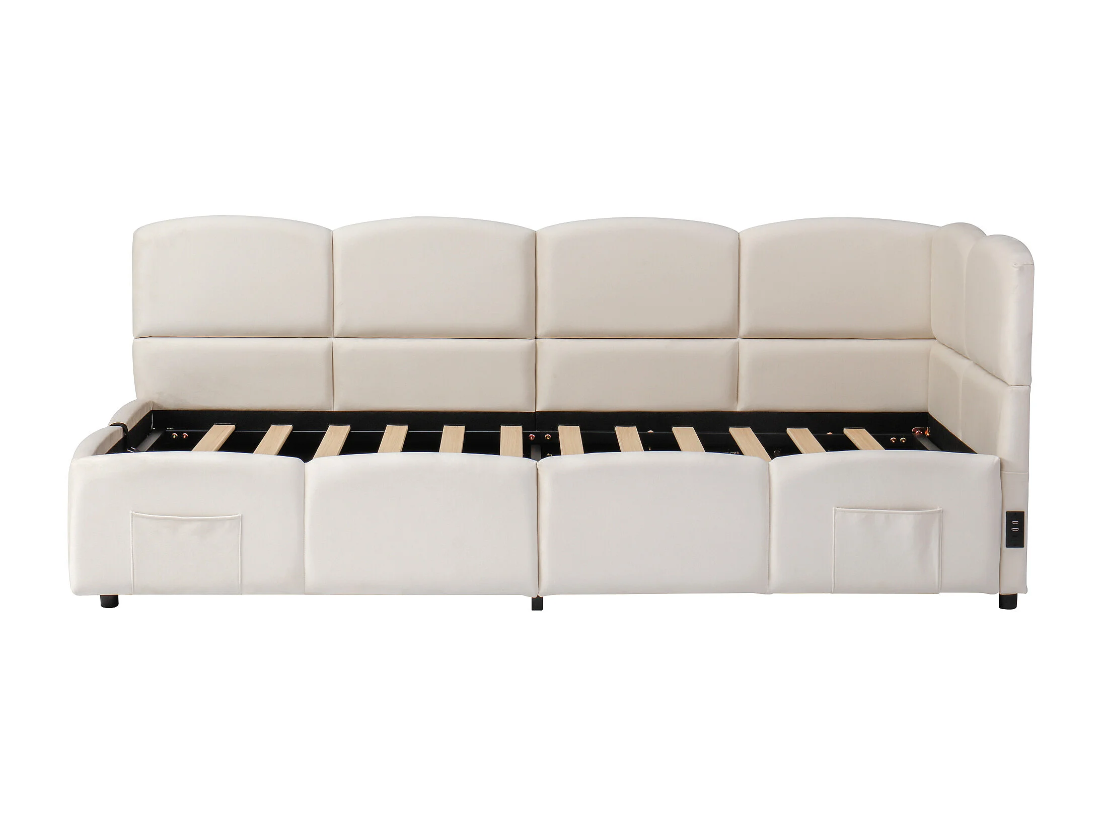 Lit banquette 90x200 cm avec rangement et sommier à lattes, prise USB - velours beige (sans matelas)