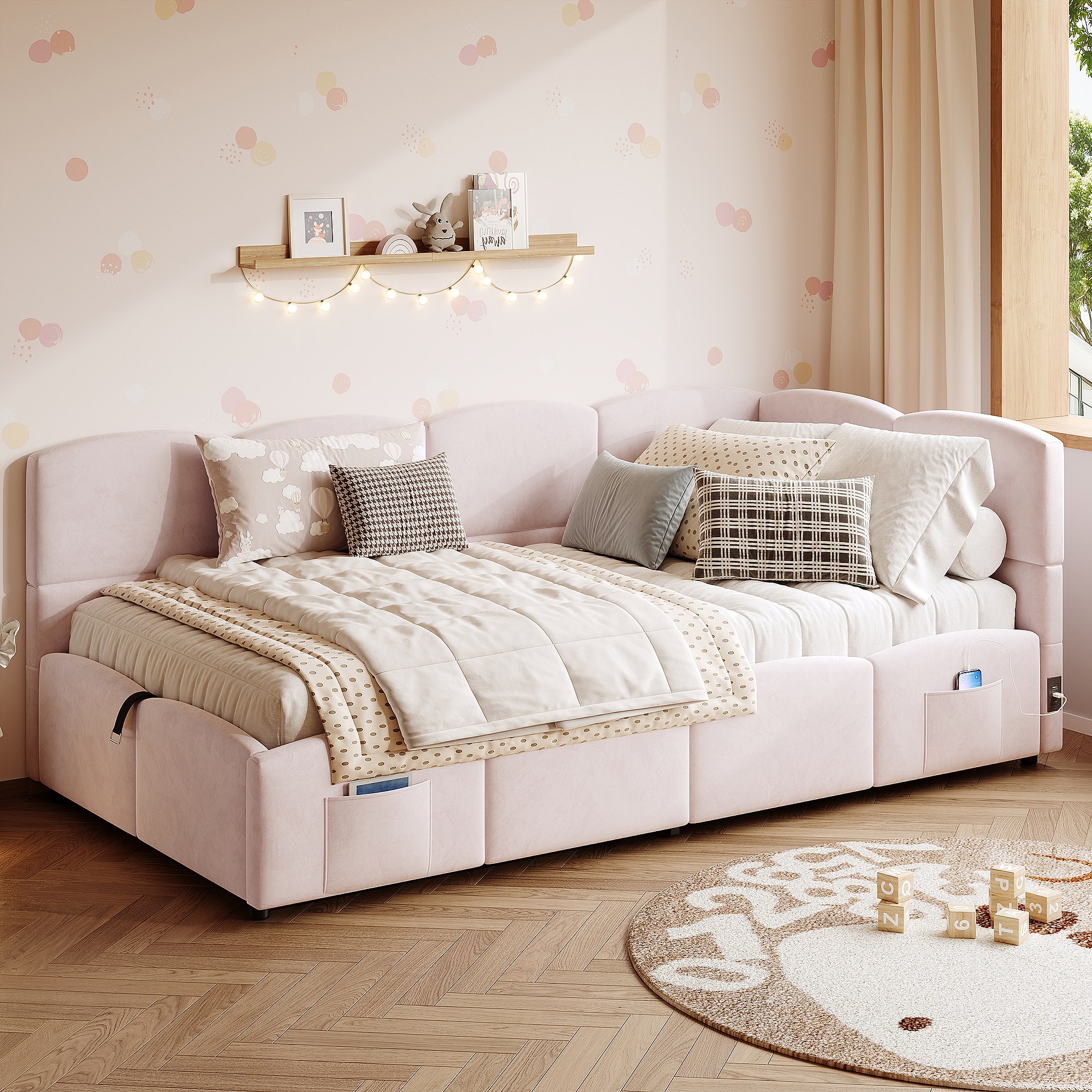 Lit banquette 90x200 cm avec rangement et sommier à lattes, prise USB - velours rose (sans matelas)