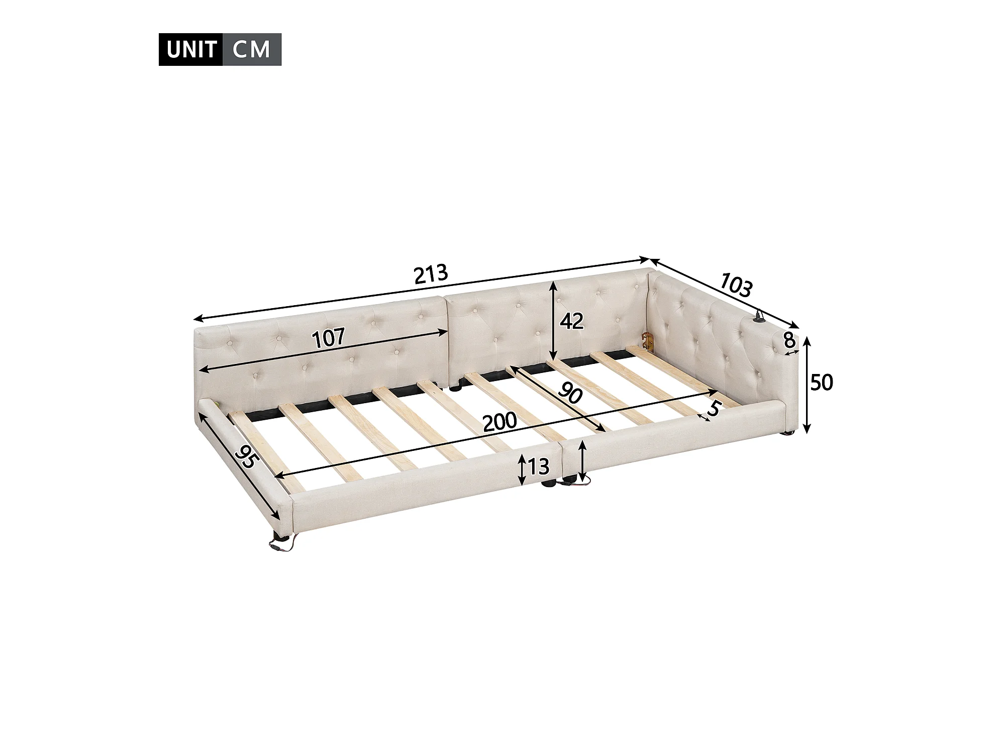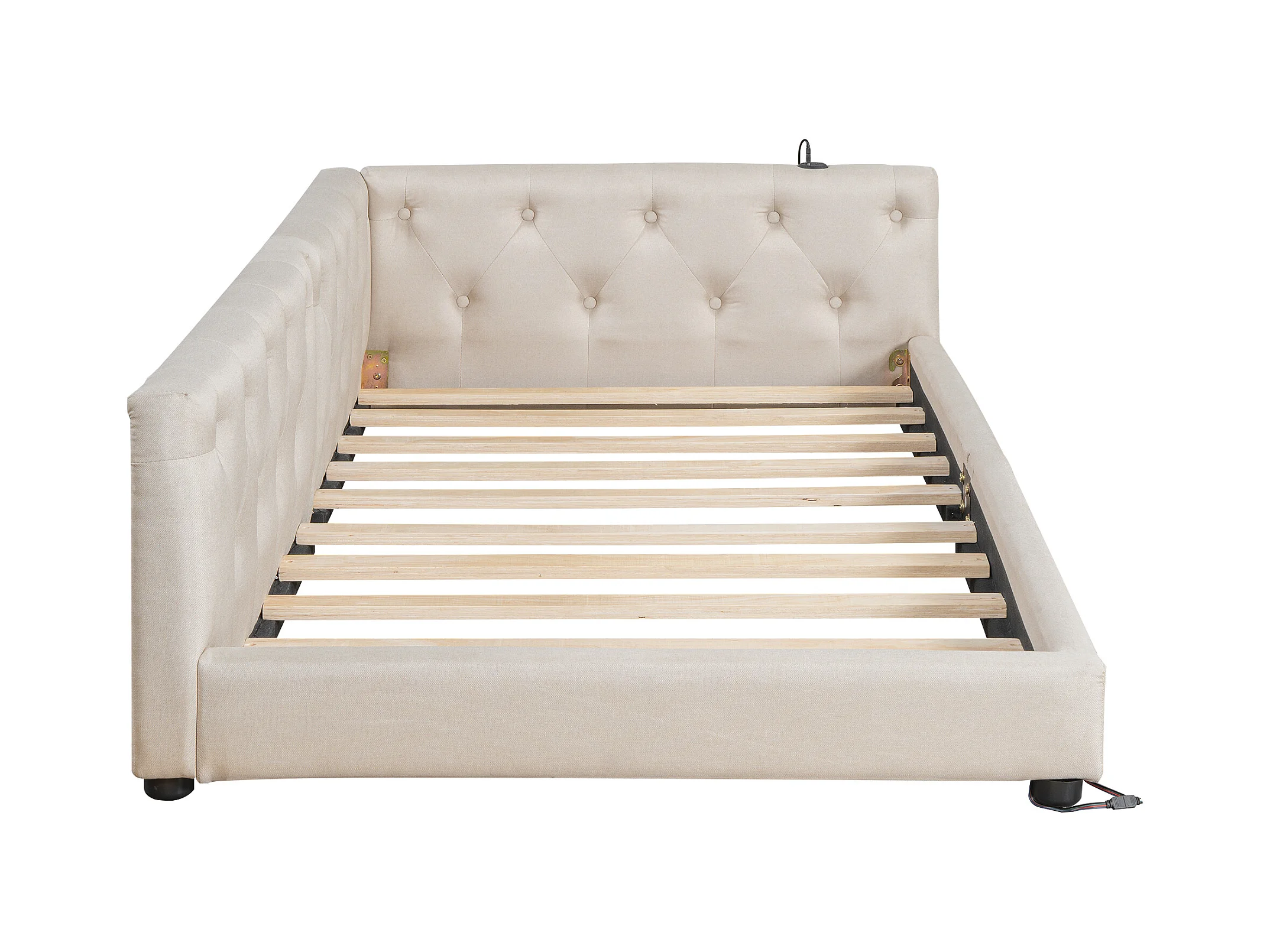 Lit banquette simple 90x200 cm avec 2 tiroirs, USB + Type C et rangement, tissu lin beige