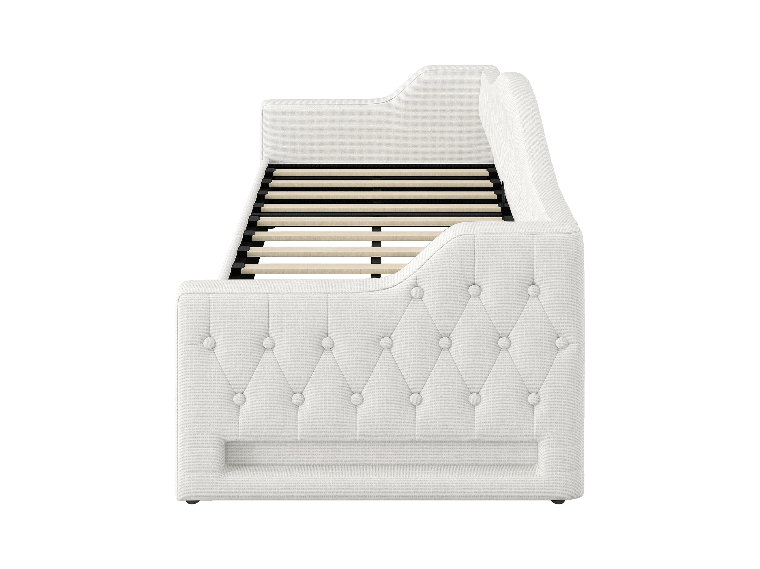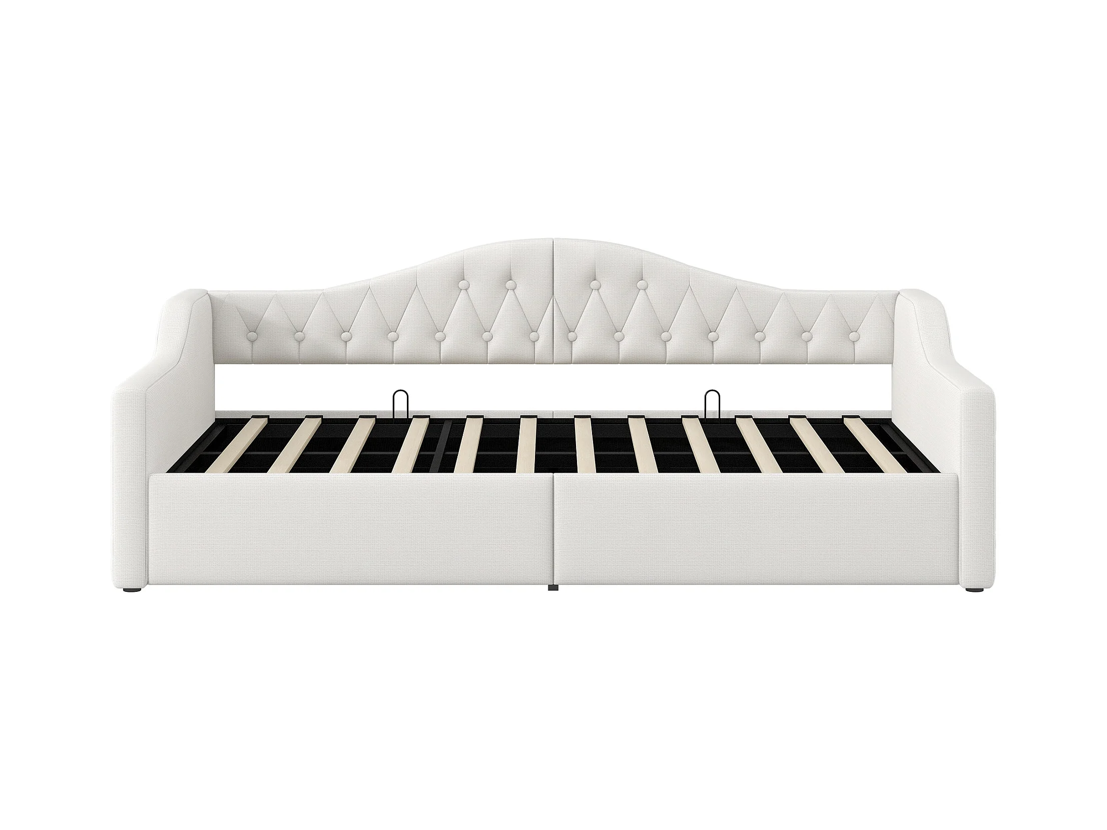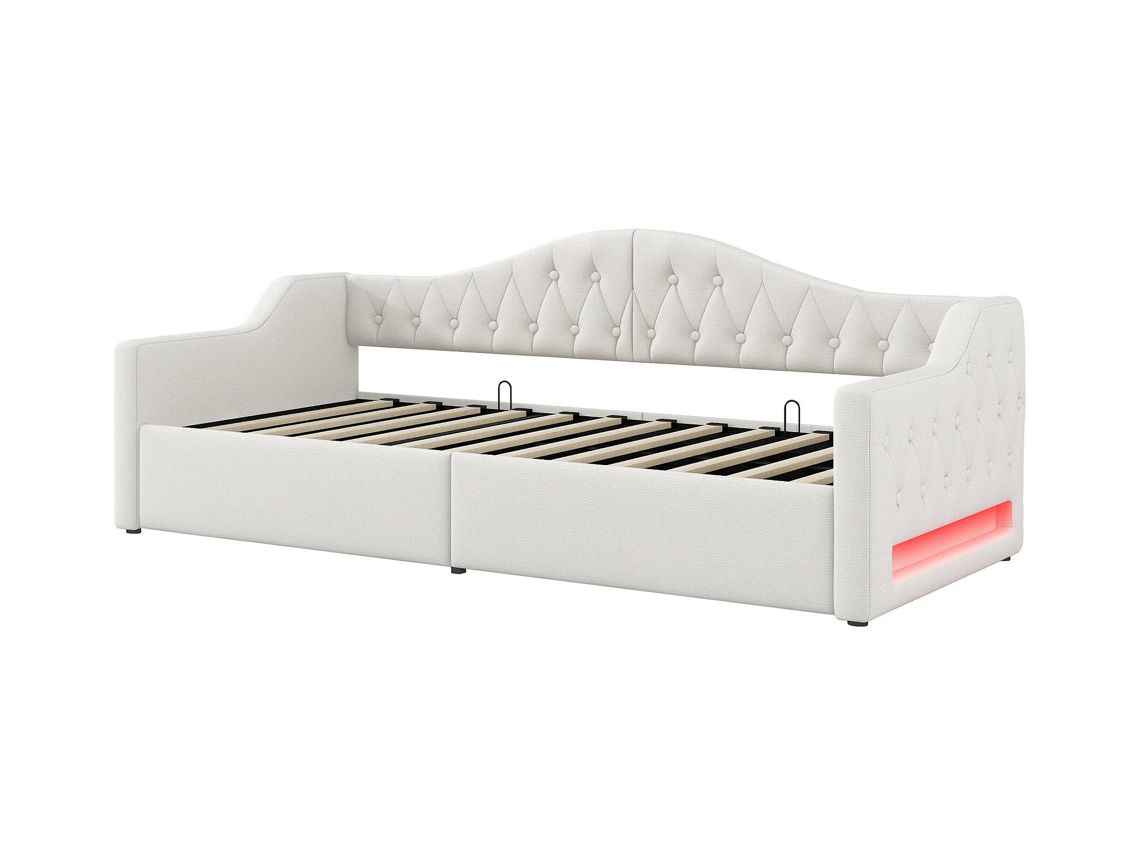 Lit banquette 90x200 cm, lin beige, lit coffre avec bande lumineuse LED et sommier à lattes - sans matelas