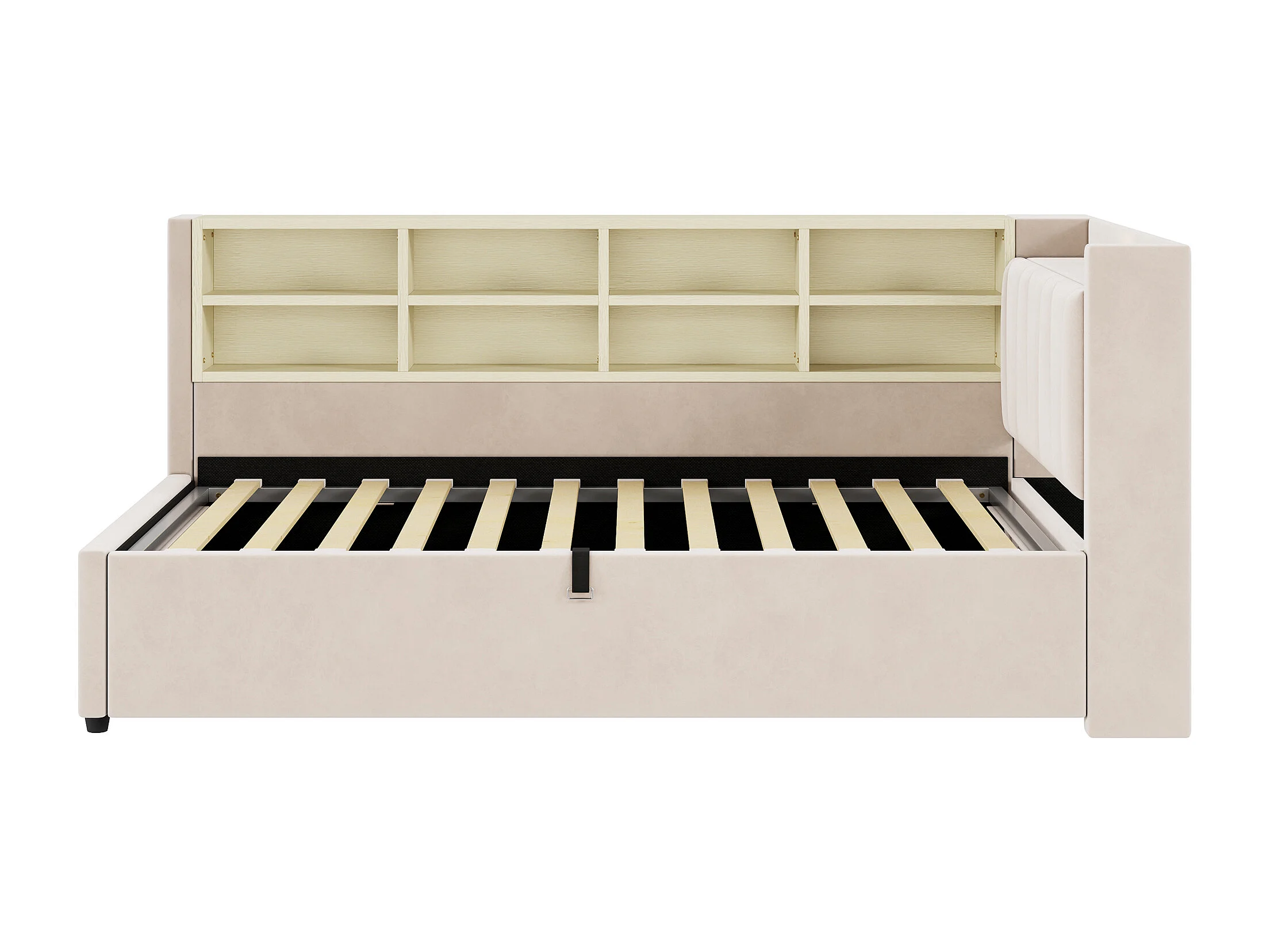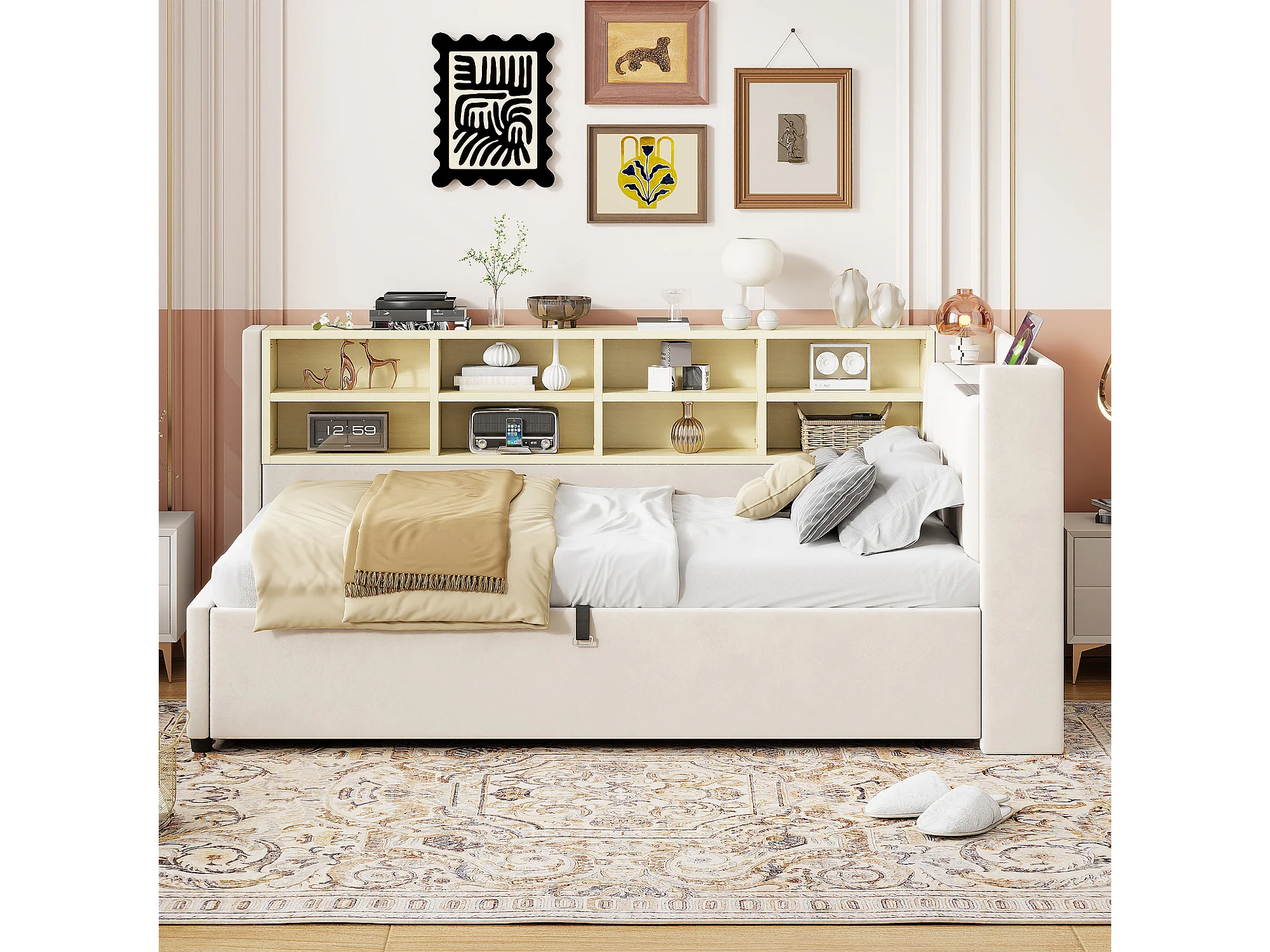 Lit banquette 90x200 cm, velours beige, lit coffre avec LED et USB, étagère de rangement - sans matelas