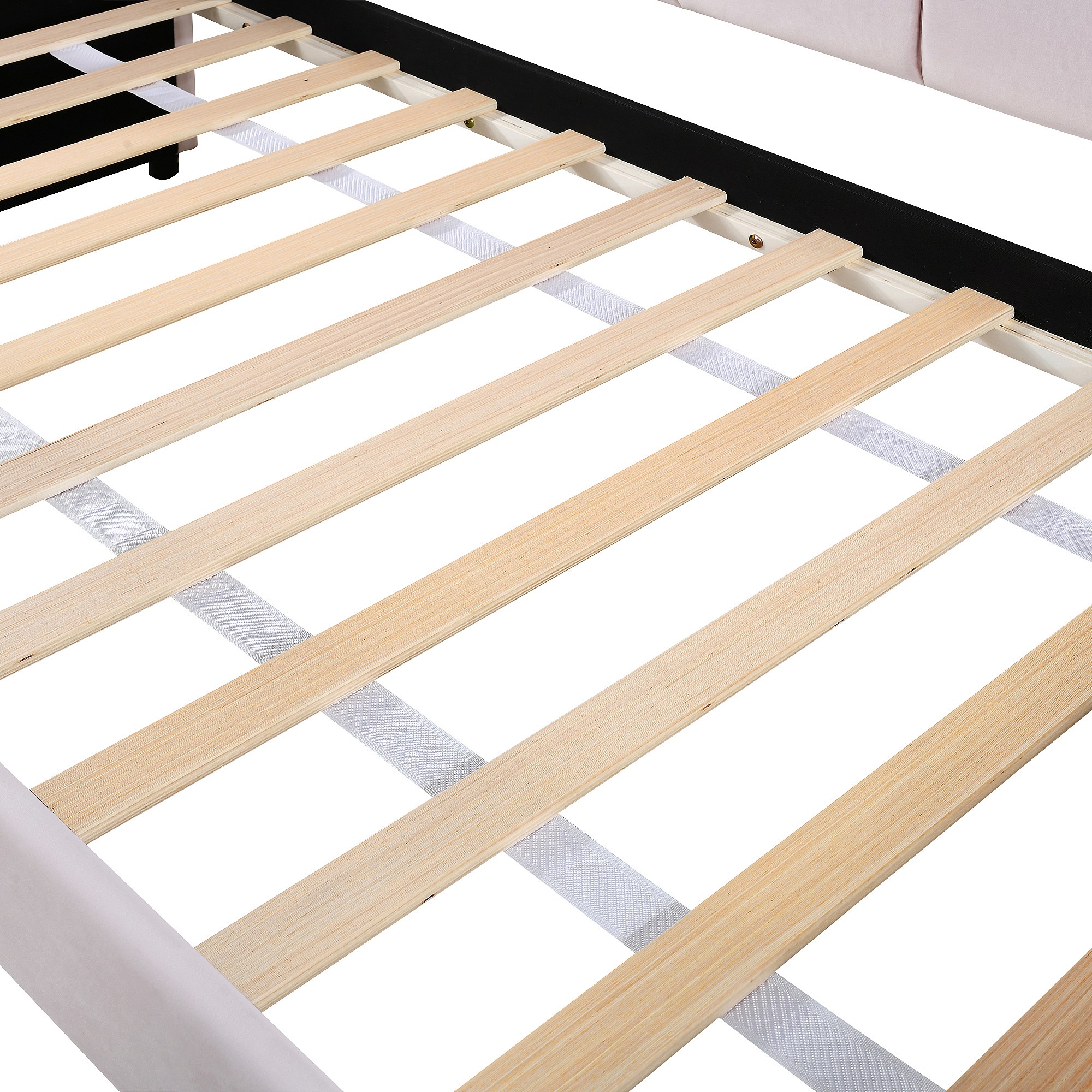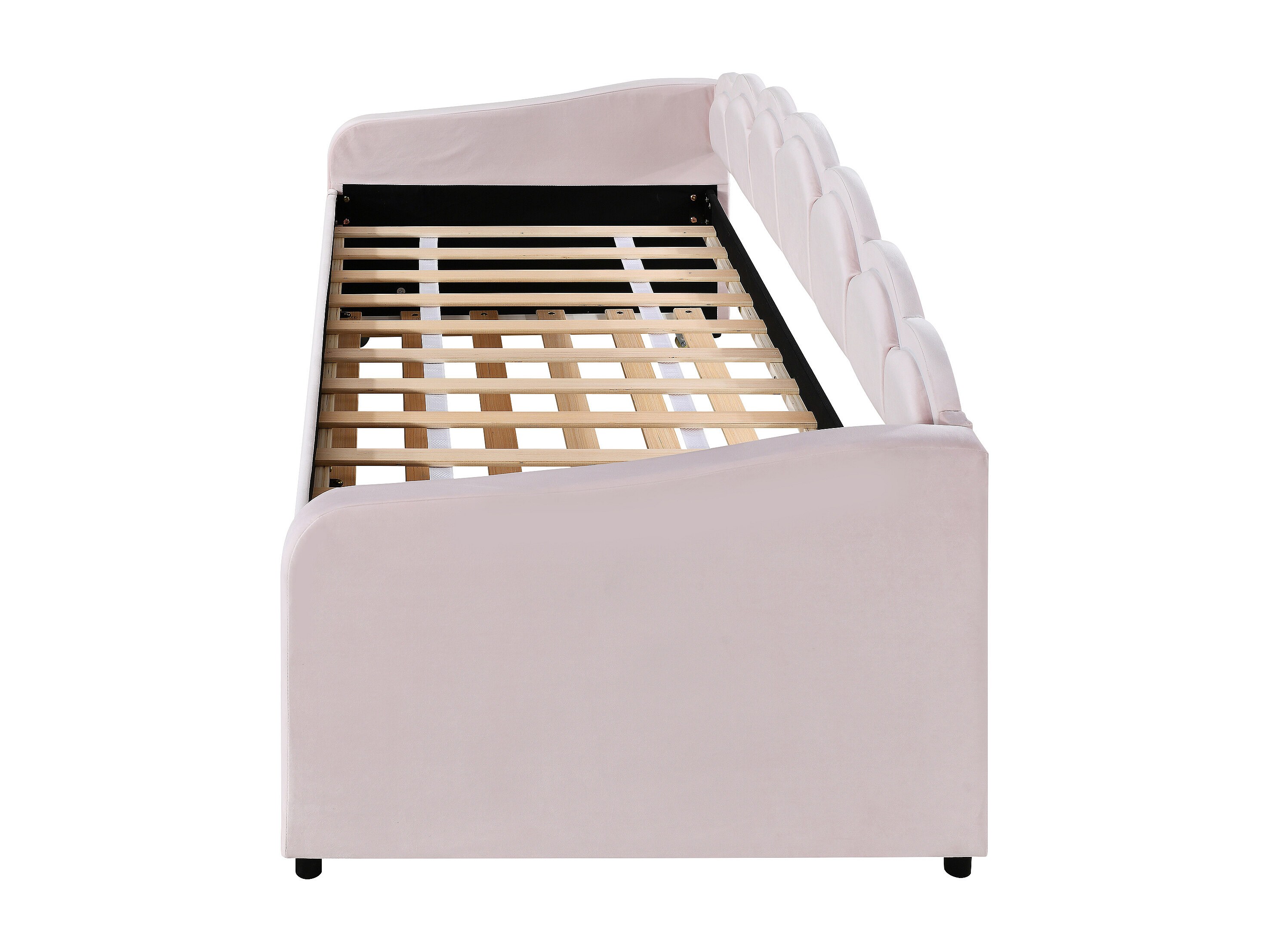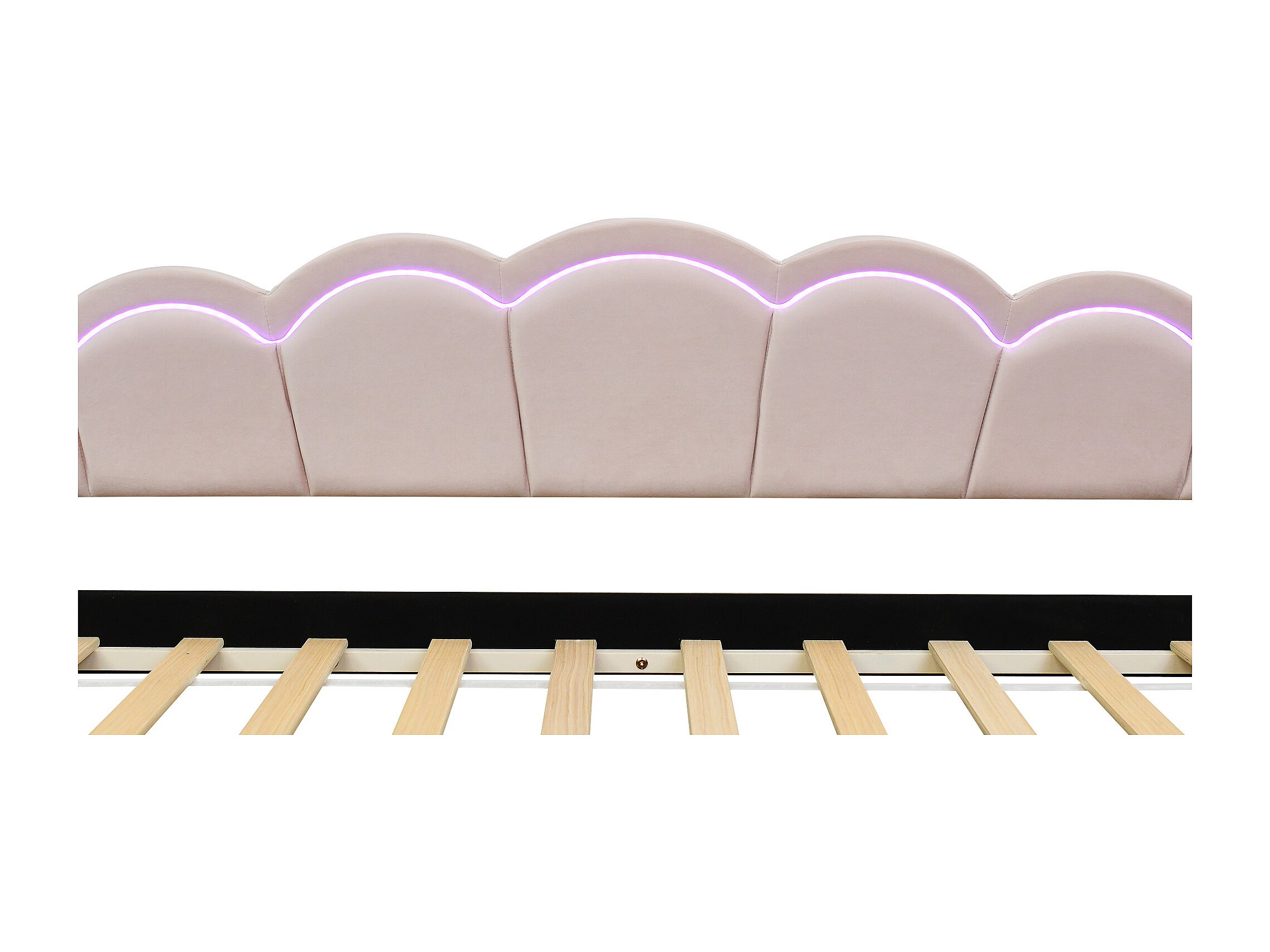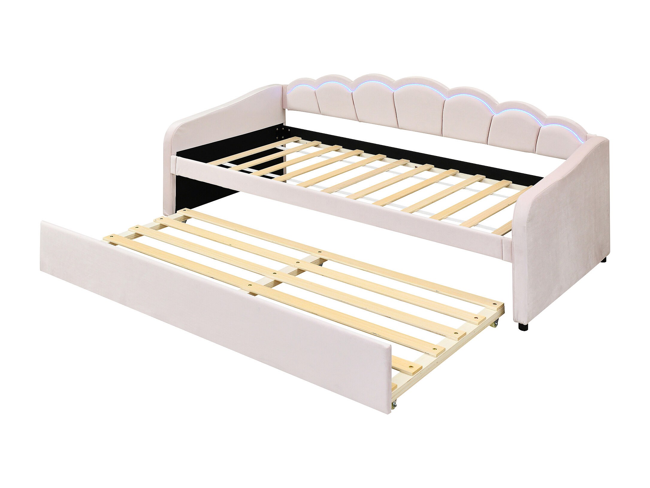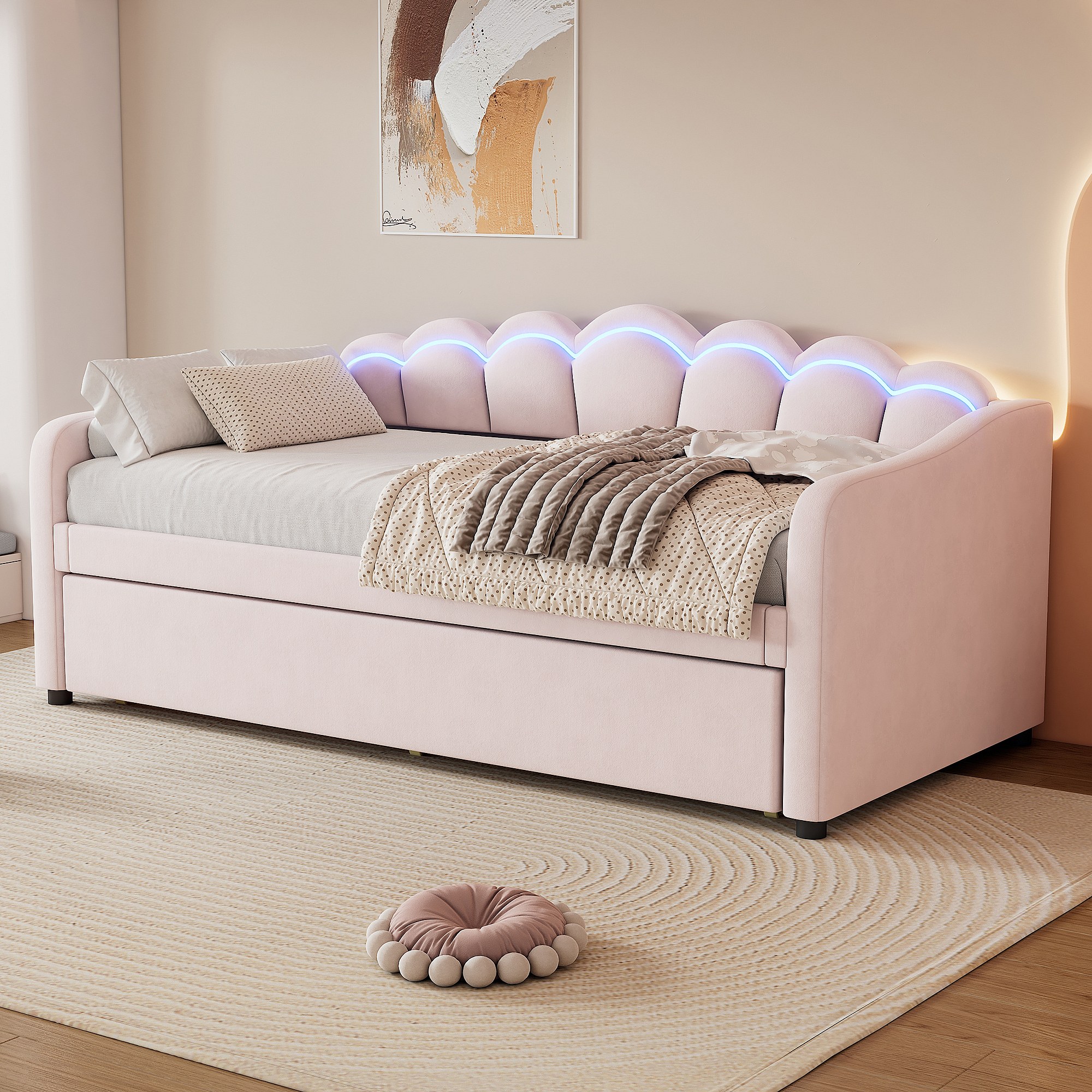 Lit banquette 90x200cm avec LED + lit gigogne 90x190cm - rembourré en tissu velours - Rose (matelas non inclus)