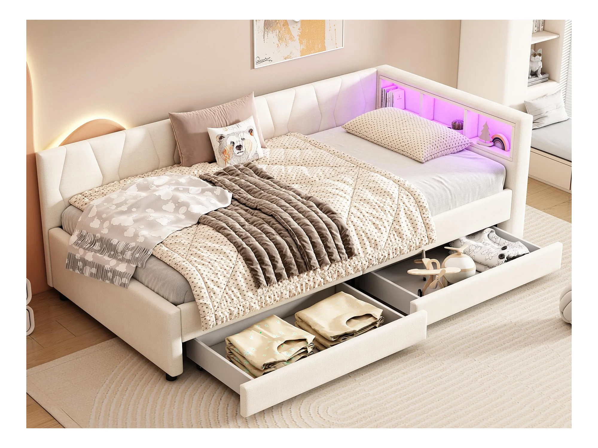 Lit banquette 90x200 cm, lin beige, Lit adulte avec chargement USB et éclairage , 2 tiroirs, sans matelas