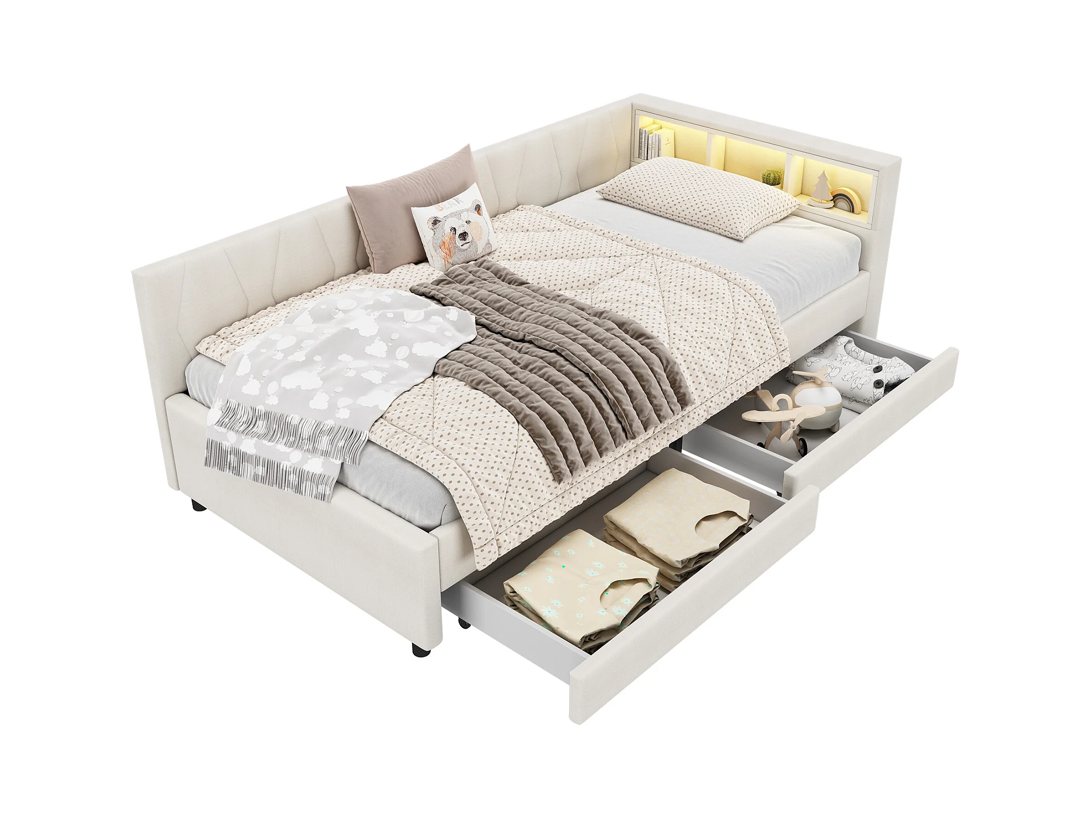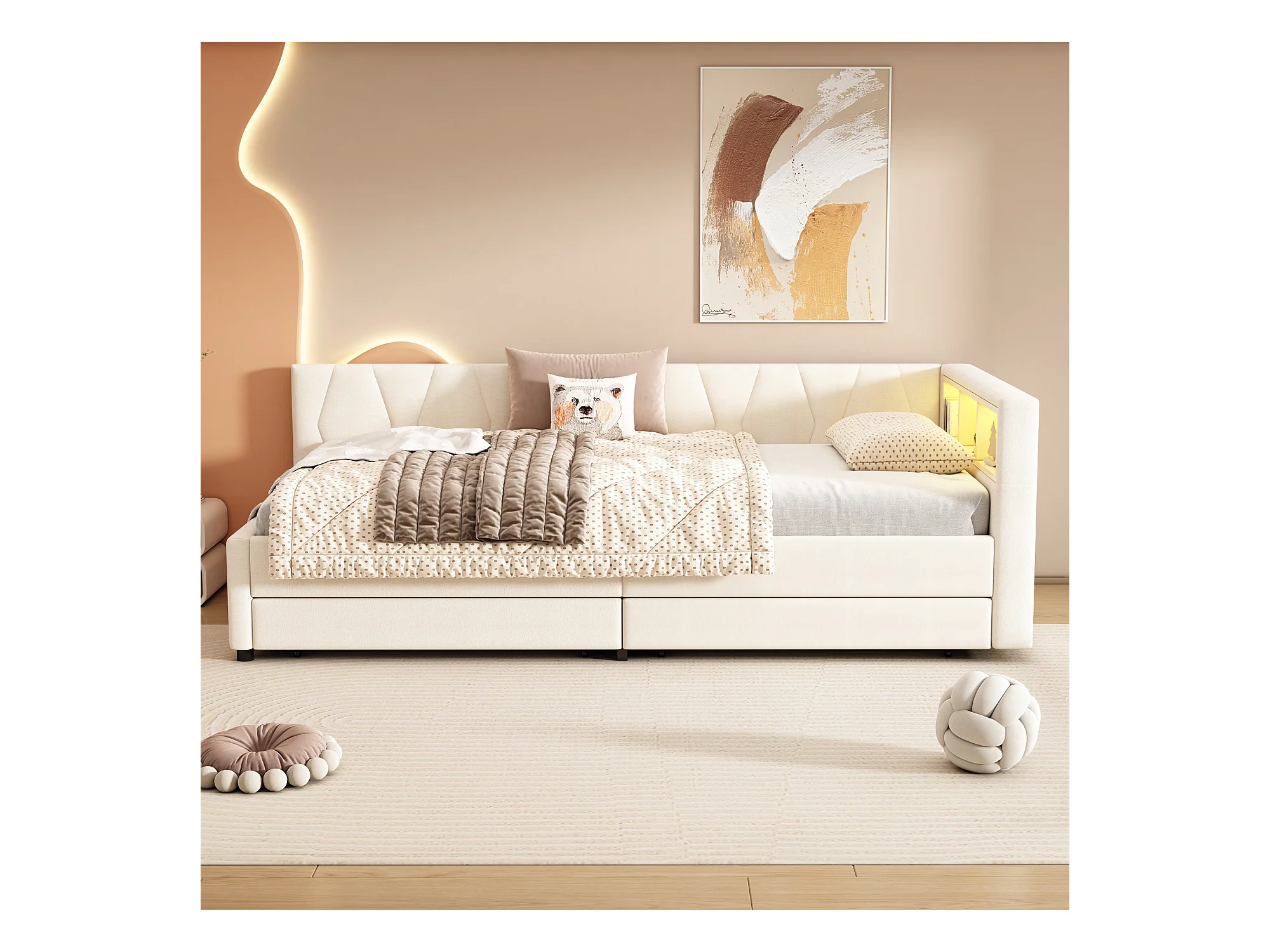 Lit banquette simple 90x200 cm avec 2 tiroirs, USB + Type C et rangement, tissu lin beige