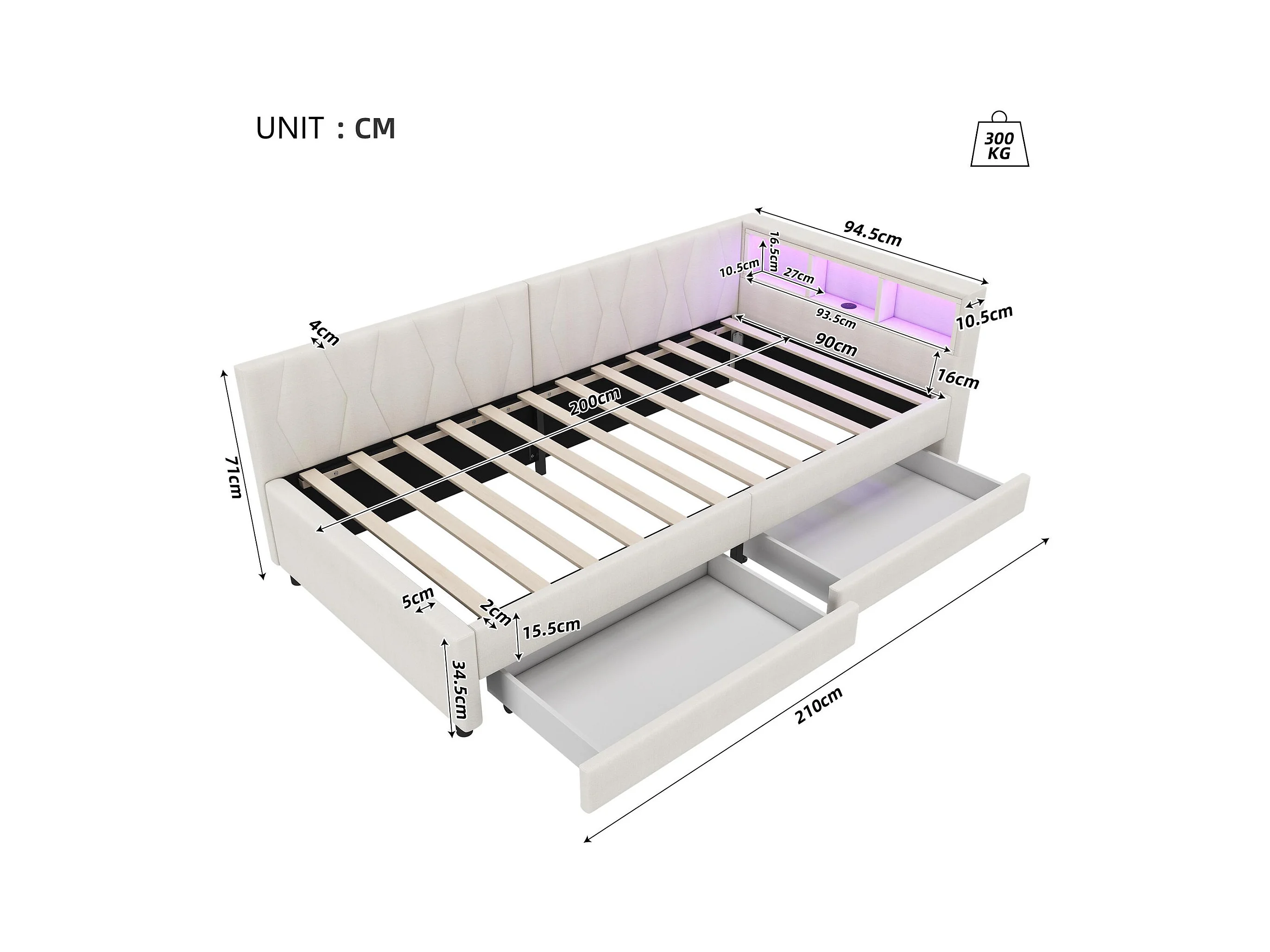 Lit banquette en lin 90x200cm avec LED - 2 tiroirs & ports USB - avec sommier à lattes - Beige