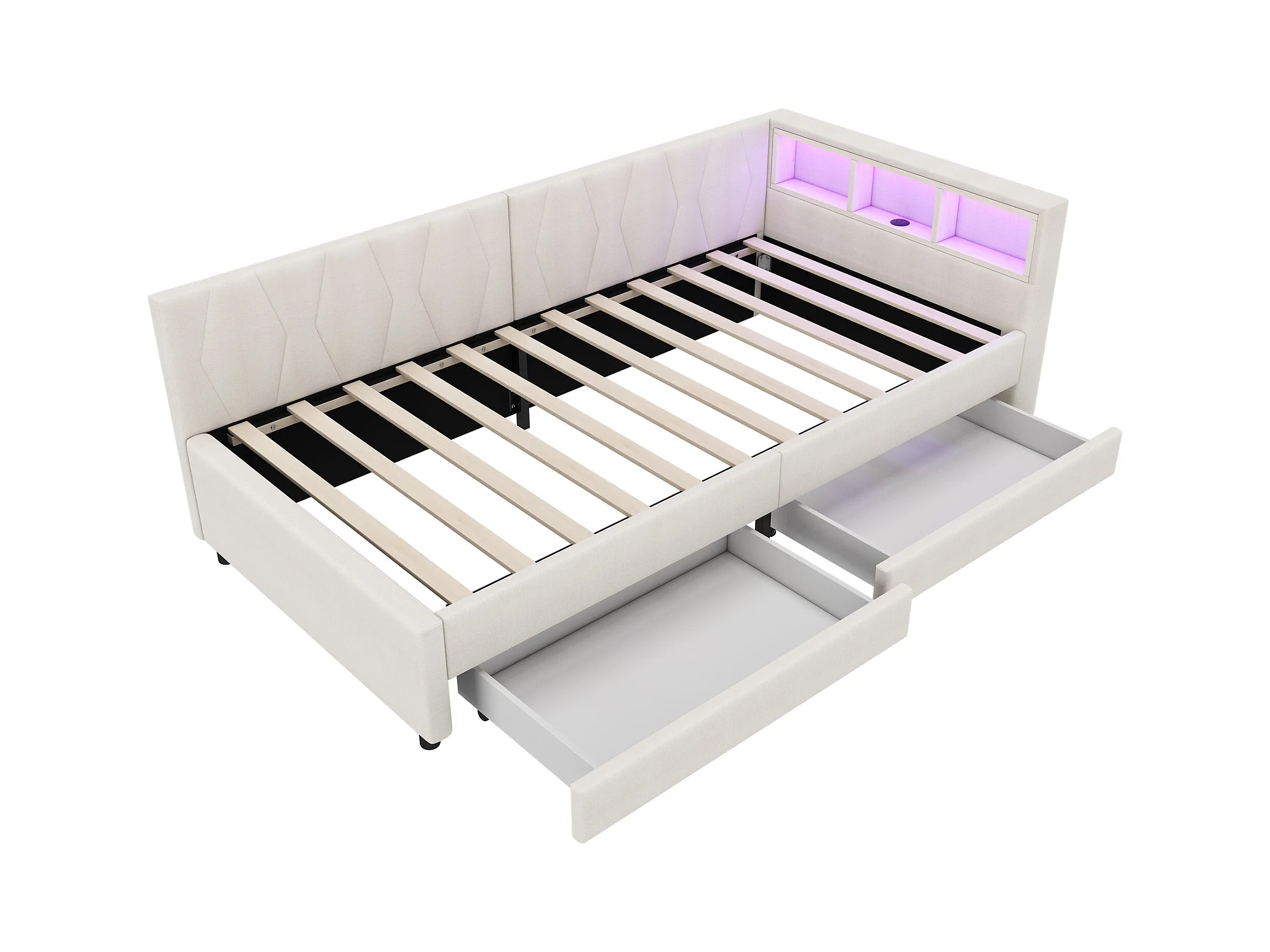 Lit banquette 90x200 cm, lin beige, avec compartiments de rangement et 2 tiroirs, port USB - sans matelas