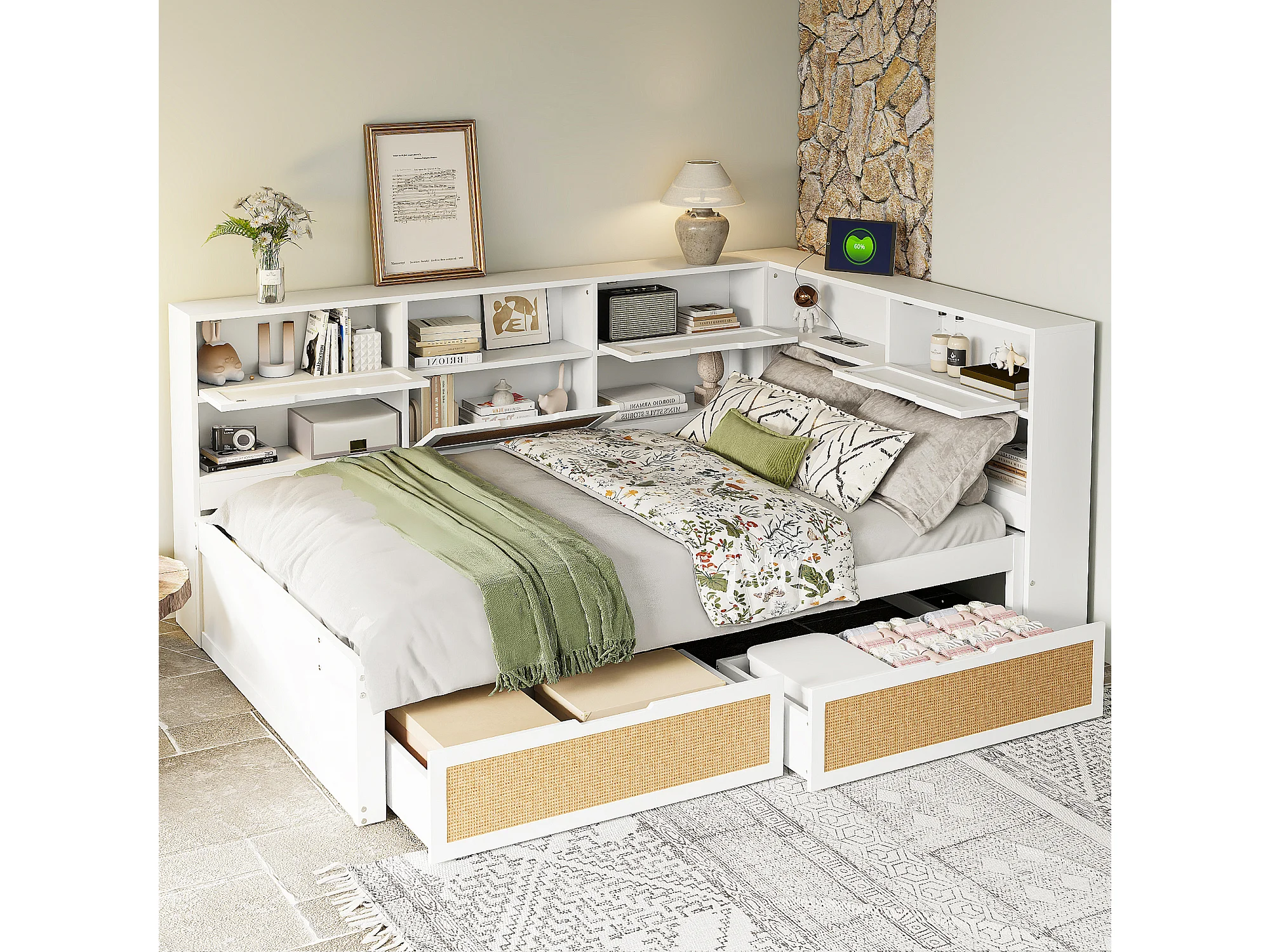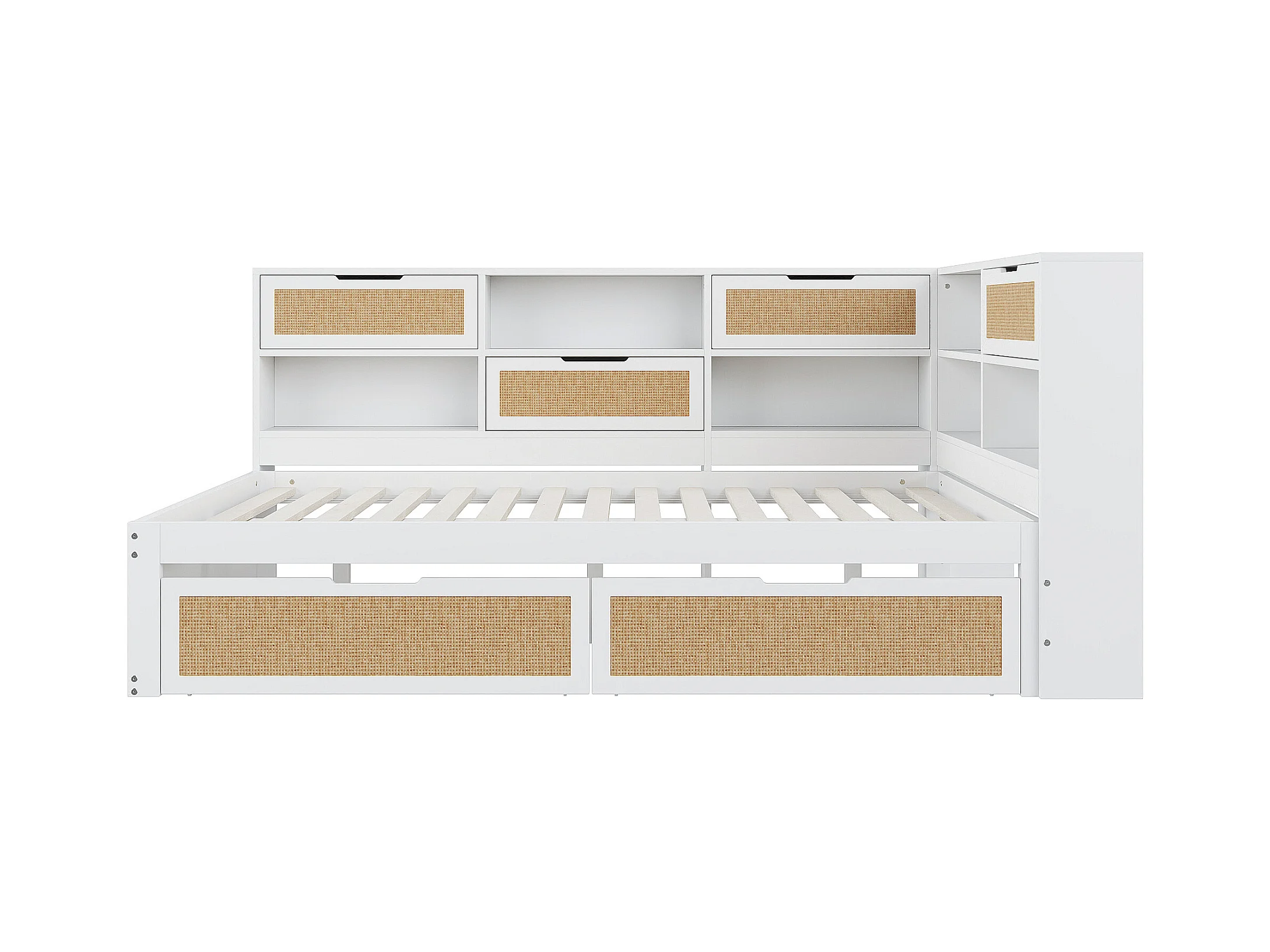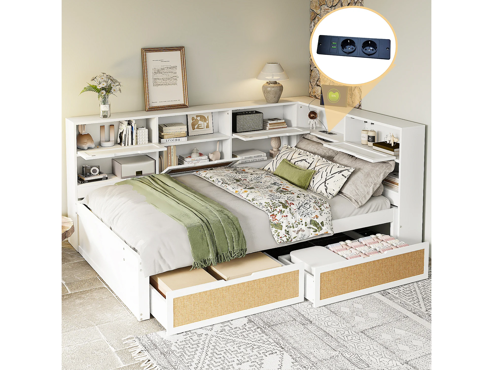Lit banquette blanc et bois 140x200cm avec tiroirs, multiples rangements et port de charge (sans matelas)