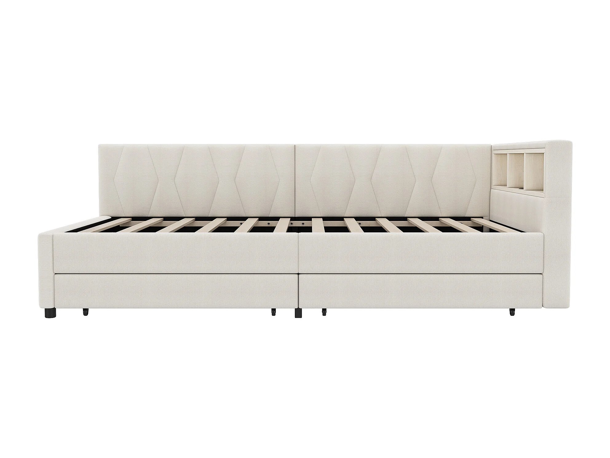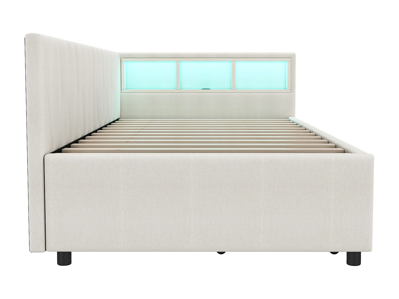 Lit banquette enfant 90x200cm beige en lin avec 2 tiroirs, LED et USB, sommier à lattes, sans matelas