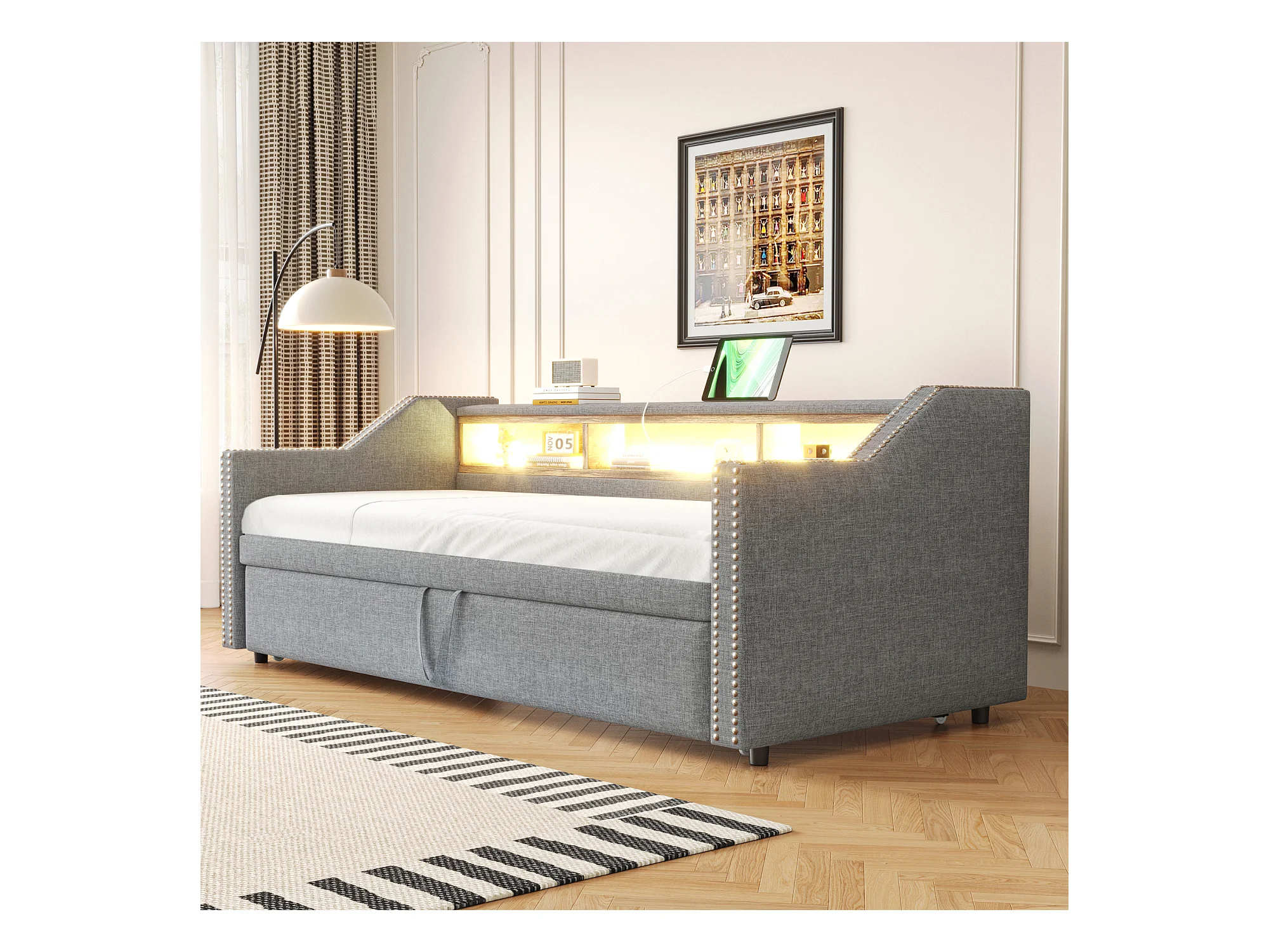 Lit banquette gigogne 90/180x190cm en lin - avec LED & USB - avec sommier à lattes - Gris clair