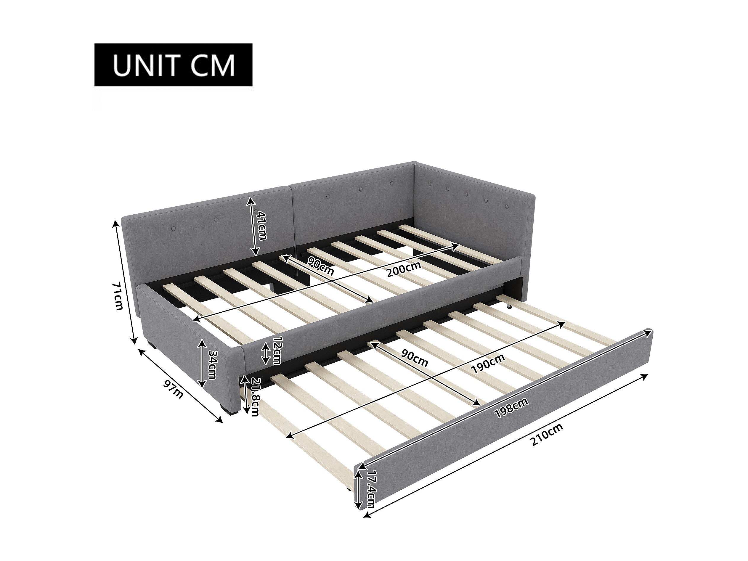 Lit simple 90x200 cm avec un lit gigogne - rembourré en velours avec sommier à lattes - Gris