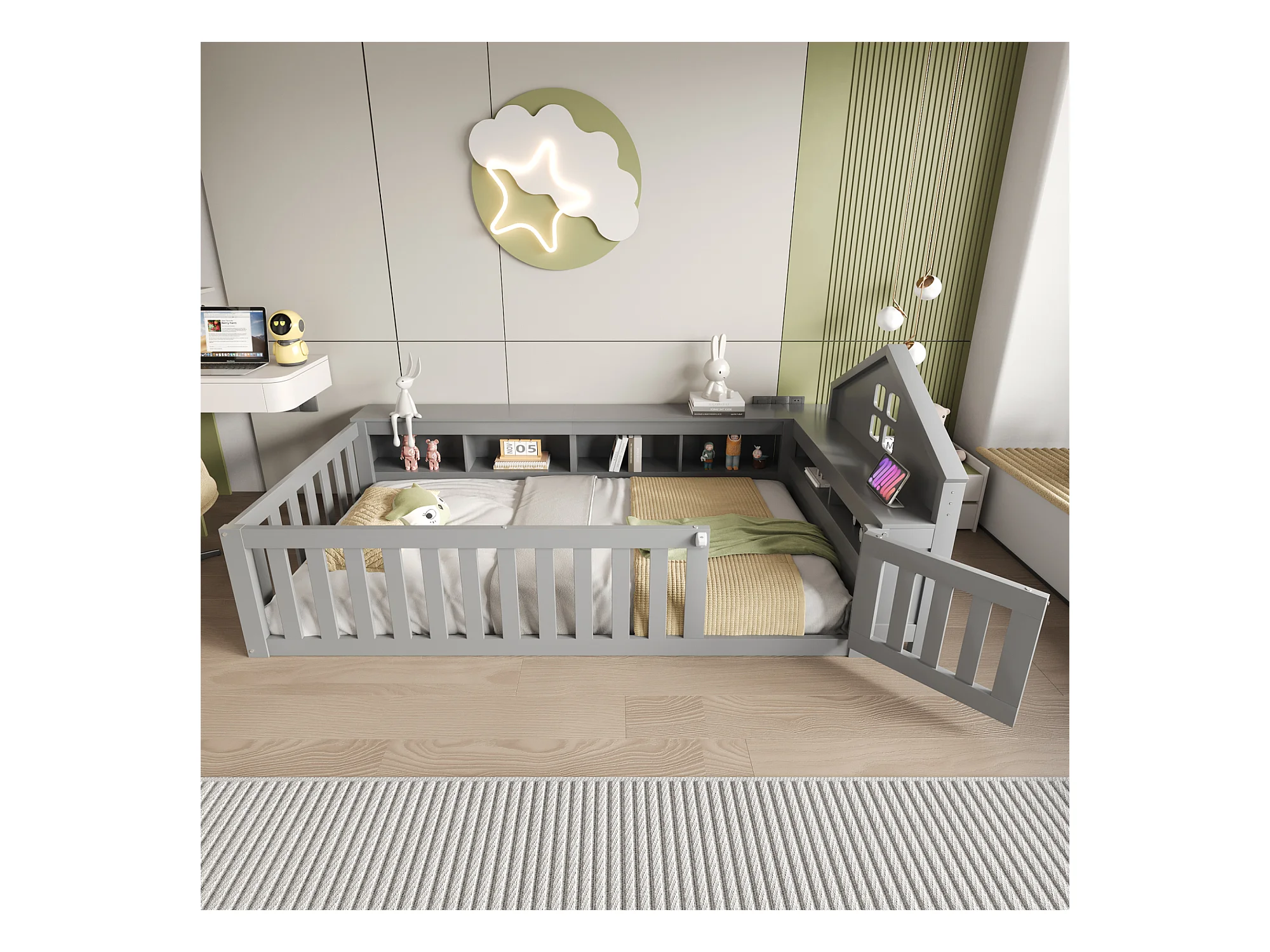 Lit bébé 90x200cm - avec rangement - avec porte - avec sommier à lattes - gris (matelas non inclus)