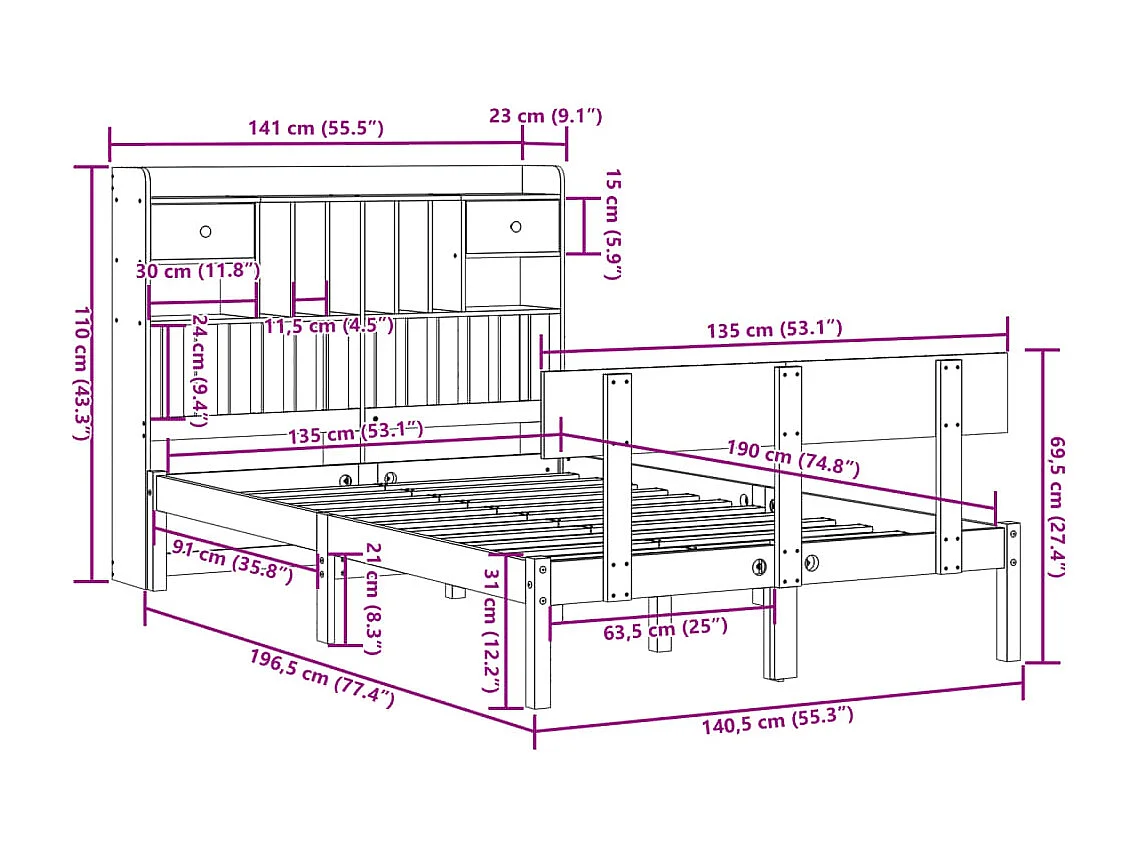 Lit bibliothèque sans matelas 135x190 cm bois de pin massif