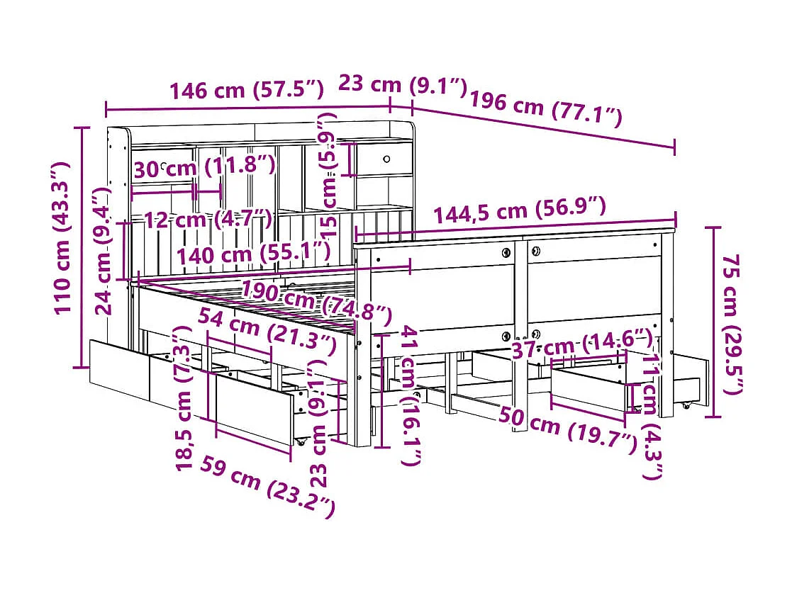 Lit bibliothèque sans matelas 140x190 cm bois massif