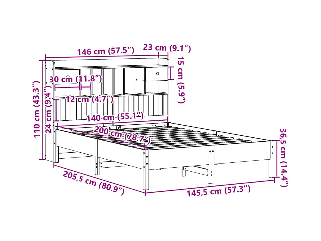 Lit bibliothèque sans matelas 140x200 cm bois massif de pin