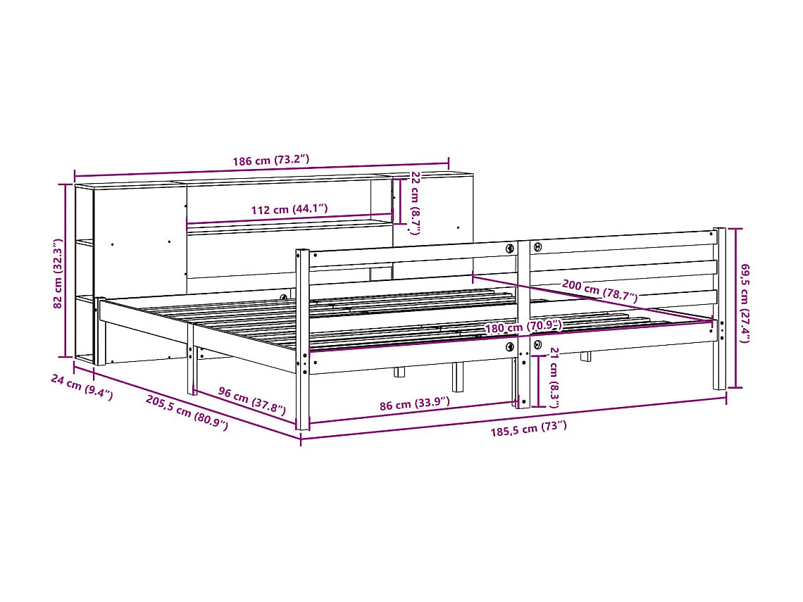 Lit bibliothèque sans matelas 180x200 cm bois massif de pin