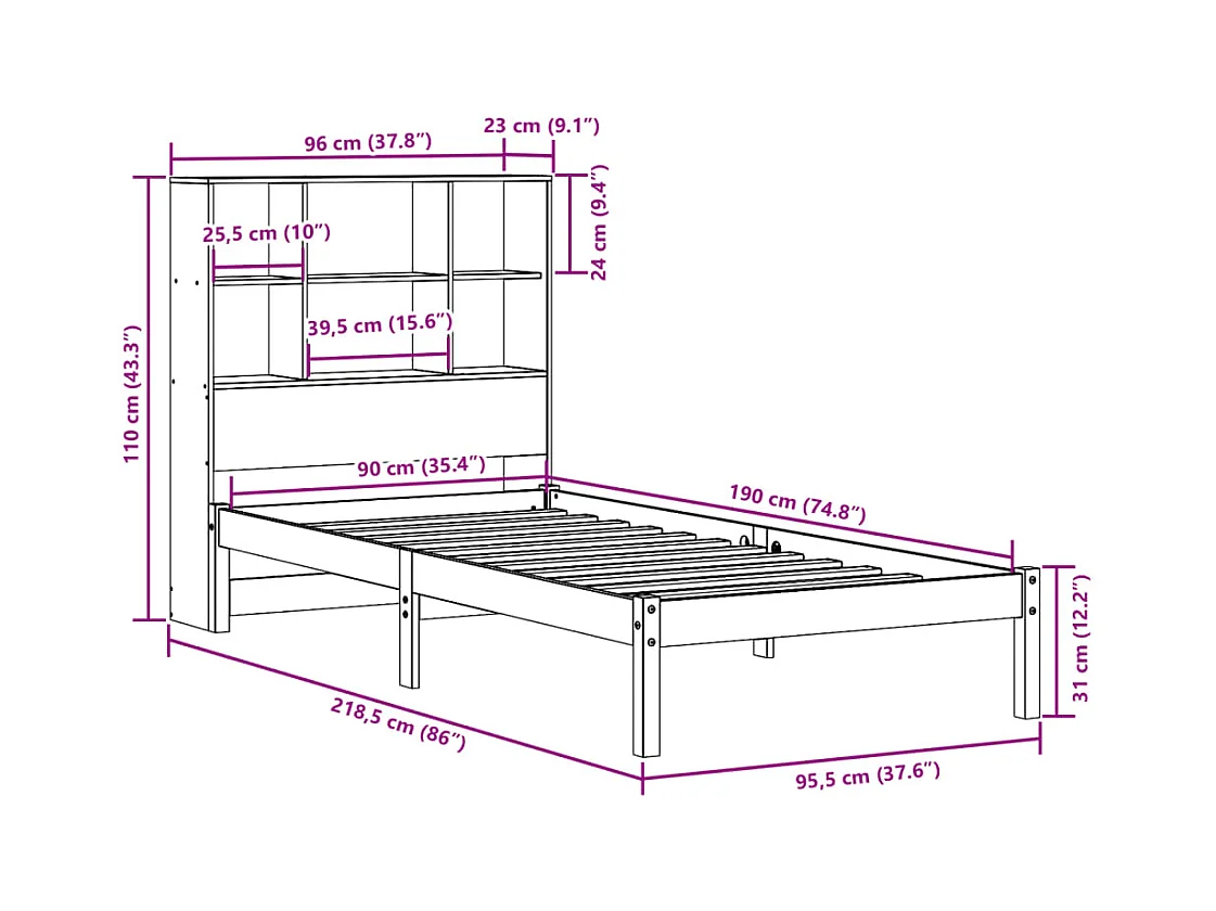 Lit bibliothèque sans matelas 90x190 cm bois de pin massif