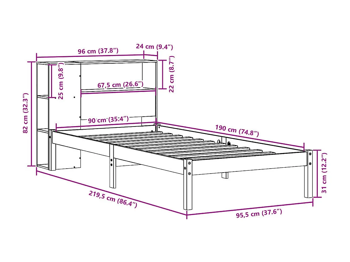 Lit bibliothèque sans matelas 90x190 cm bois de pin massif