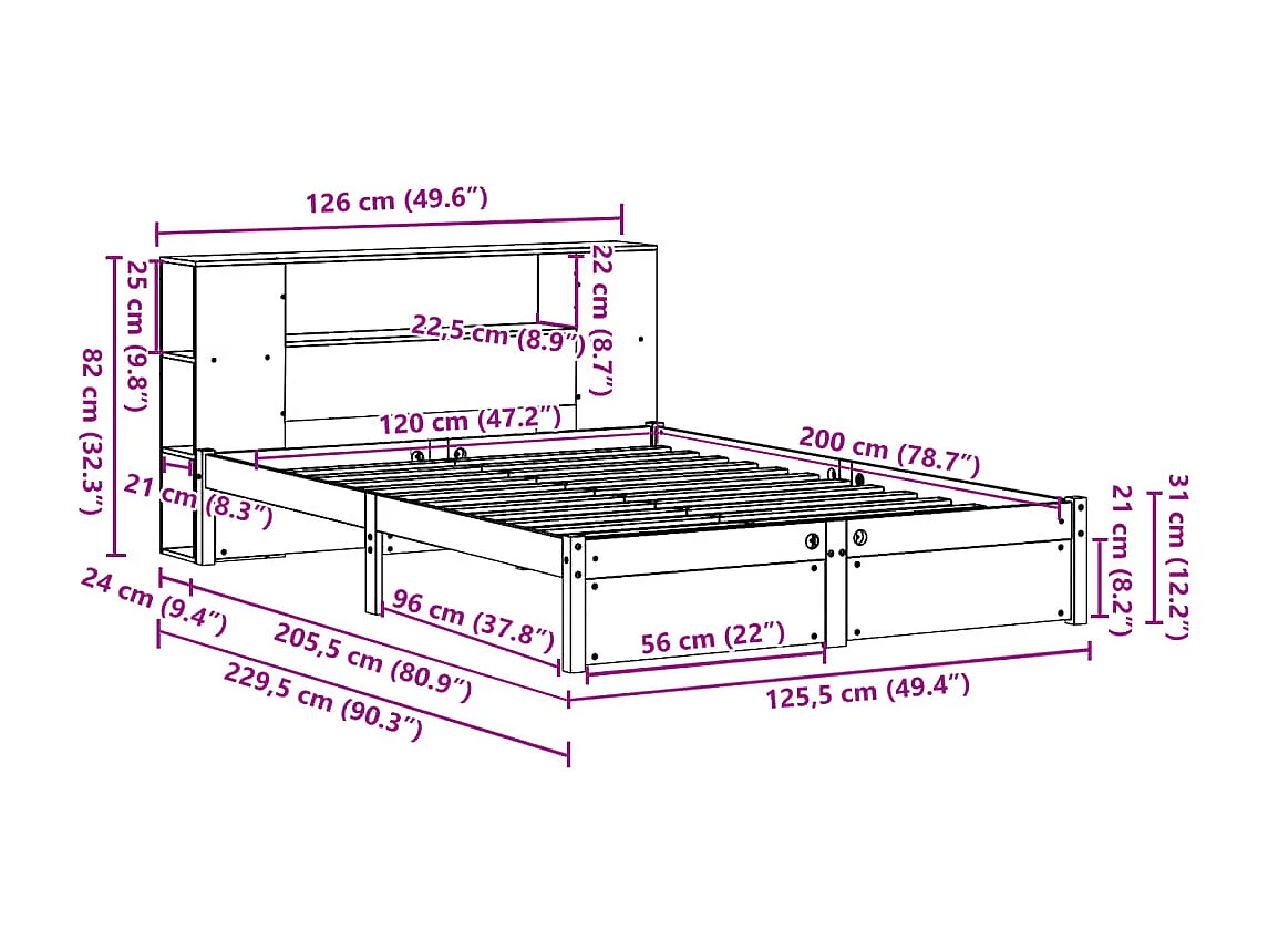 Lit bibliothèque sans matelas blanc 120x200 cm bois pin massif